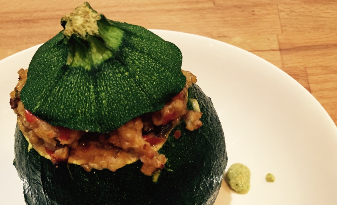 Die runden Zucchini aushölen, dabei den Inhalt würfeln und beiseite legen. Die ausgehölten Zucchinis mit einer Gabel von innen rundherum einstechen.
