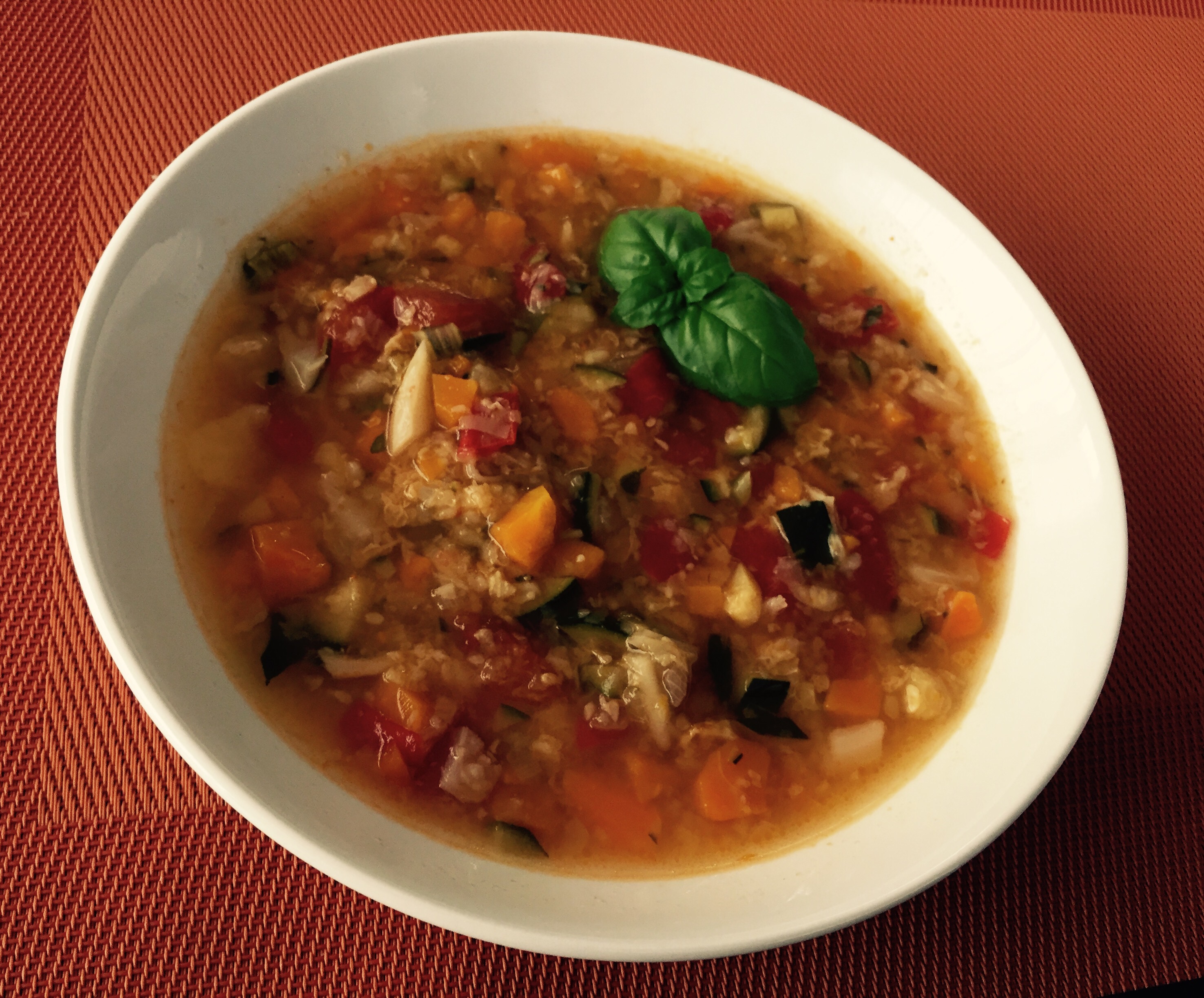 Vor dem servieren die Basilikumblätter dazugeben und etwas ziehen lassen.