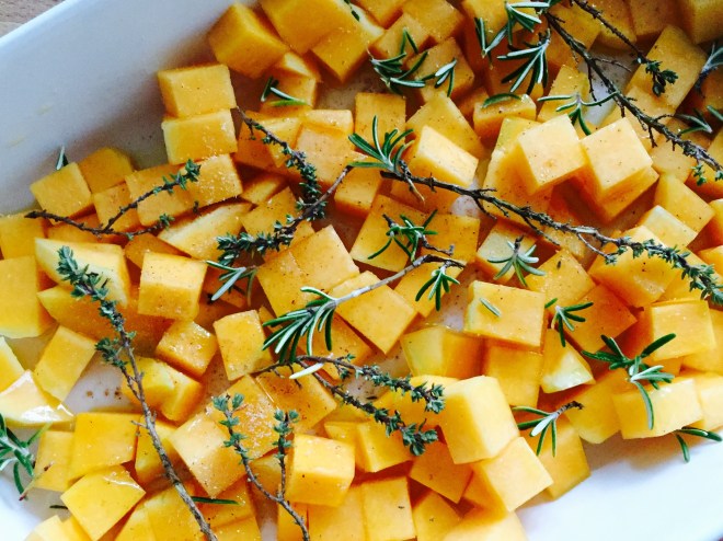 Den gewürfelten Kürbis salzen und mit dem Olivenöl, dem Rosmarin und dem Thymian im Ofen (Heissluft und Grillfubktionfslls vorhanden) bei 200 Grad garen bis er weich ist.