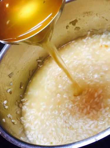 Nach und nach die heisse Brühe zufügen, und einkochen lassen. Wiederholen bis der Reis gekocht ist.