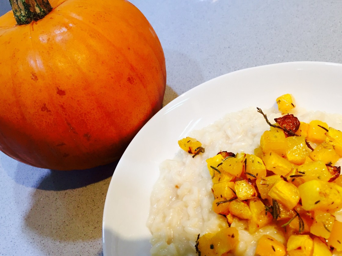 Den Risotto mit dem Kürbis im Teller anrichten.