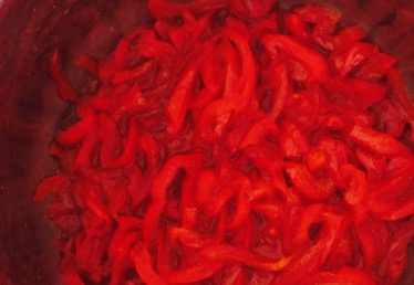 Paprika in feinen Streifen schneiden und mit etwas Olivenöl und Salz ein paar Minuten schmoren.