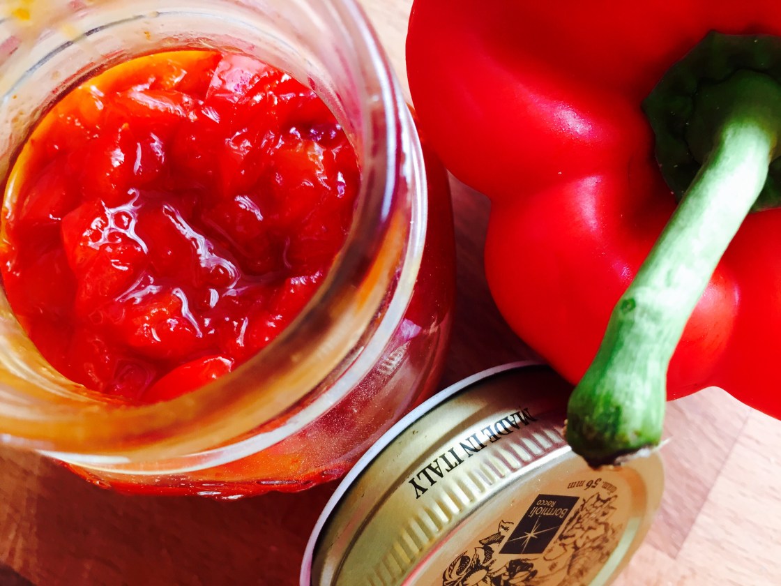 Mit geschlossenem Deckel weiterkochen bis die Paprika weich ist und die Flüssigkeit eingekocht ist (Wie die Konsistenz einer Marmelade).