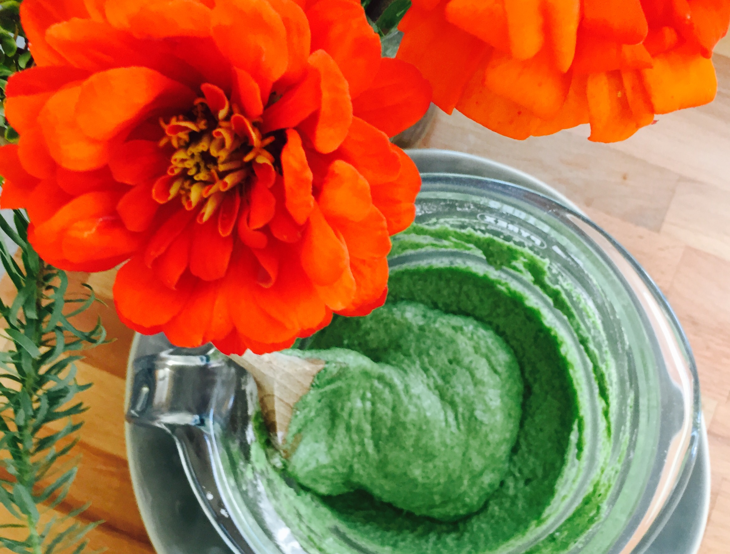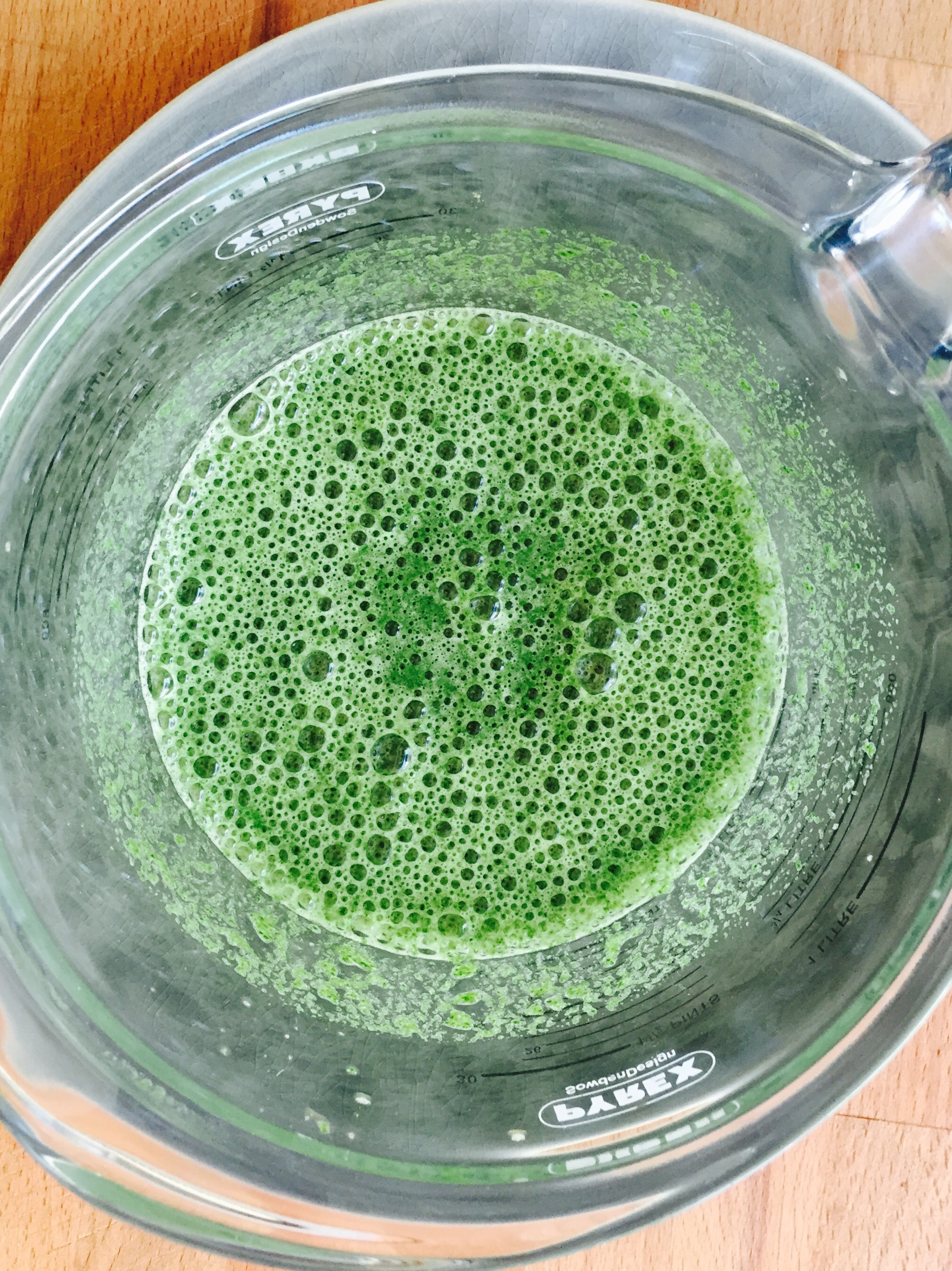 Aufgetauten Spinat, das Ei und das Wasser mit Salz und Muskatnussmischen und mit den Stabmixer fein pürieren.