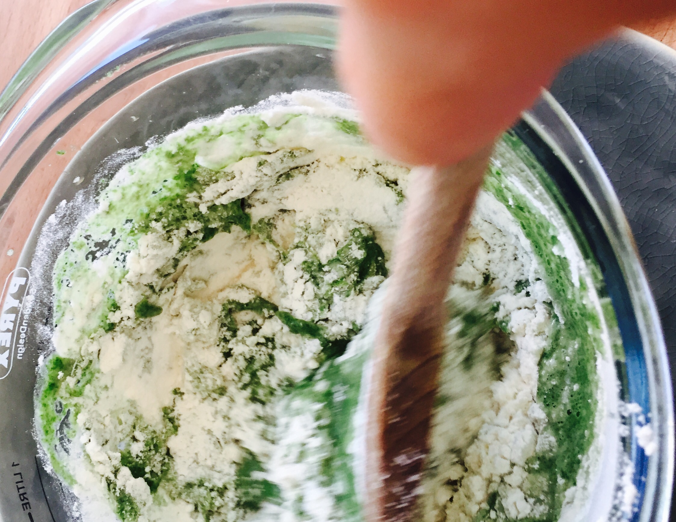 Mehl mit einen Holzkochlöffel unterschlagen bis der Teig blasen schlägt.