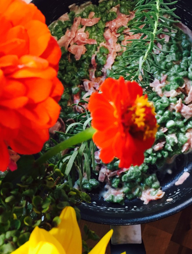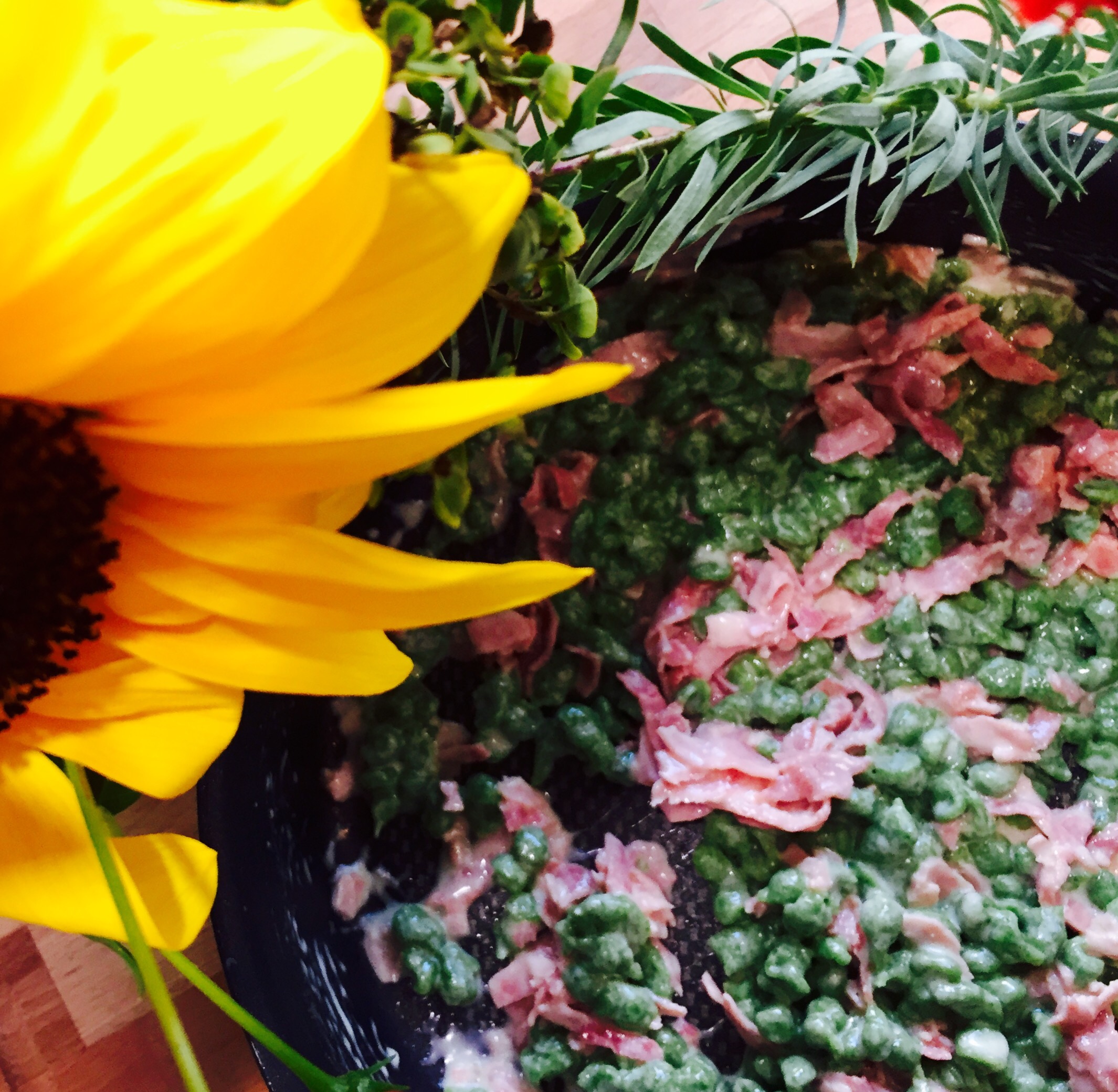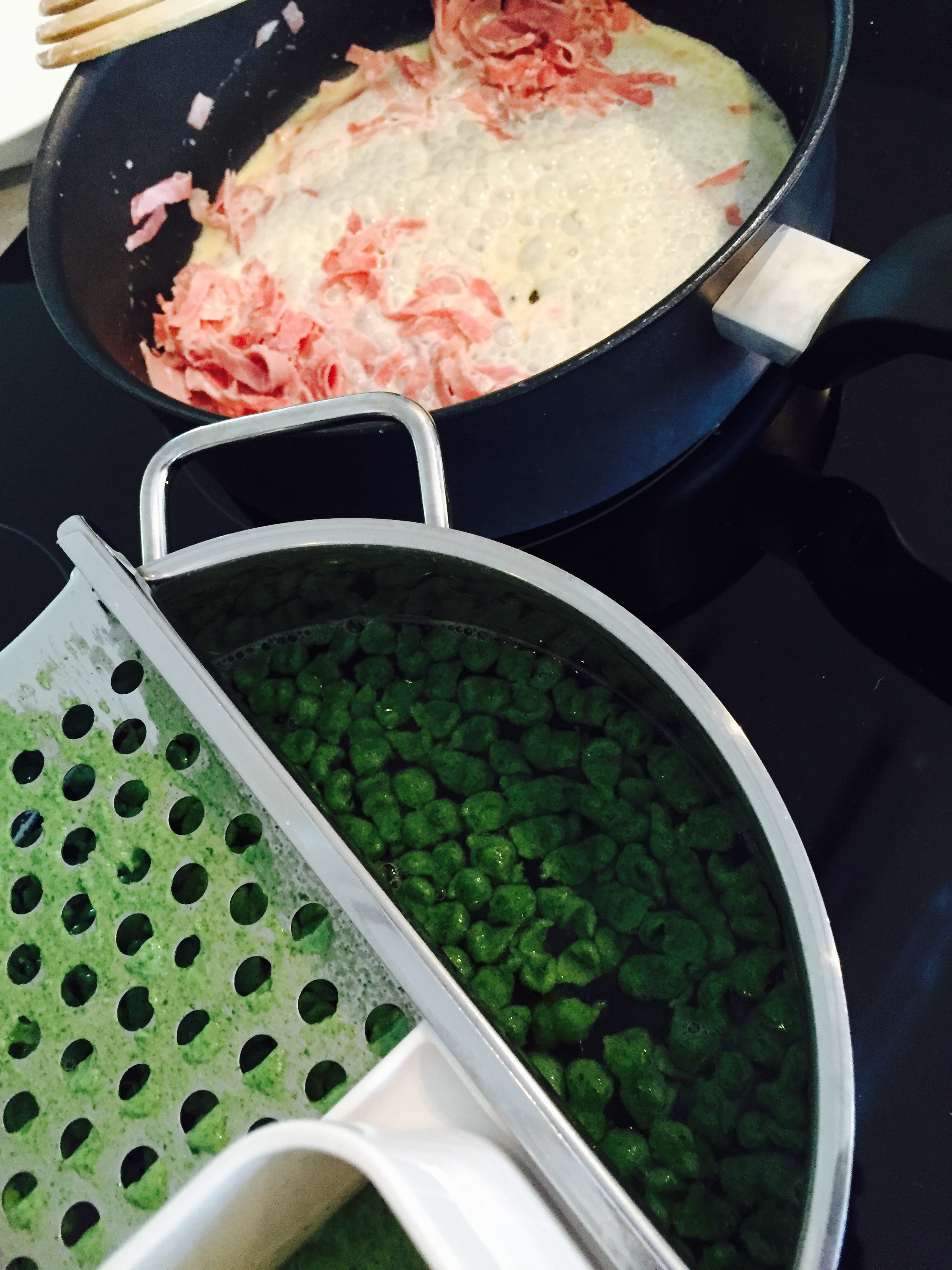 In einer Pfanne den in Streifen geschnittenen Schinken in Butter etwas schwenken und die der Sahne aufgiessn. Mit dem Parmesan zu einer cremigen Sauce binden. Die gekochten Spatzlen unterheben.