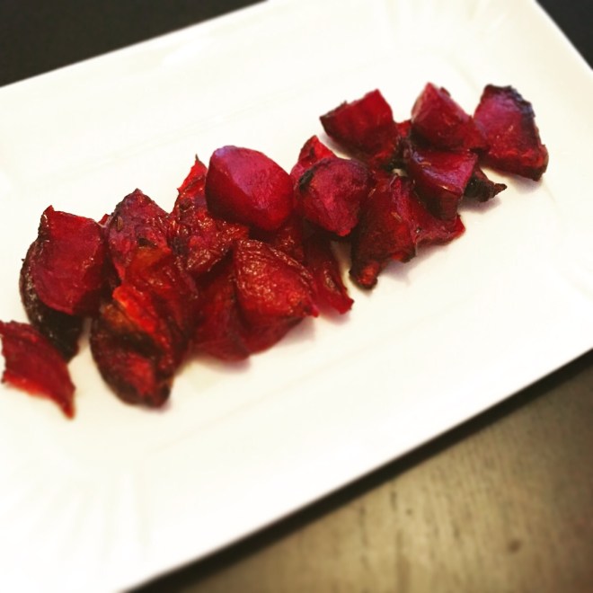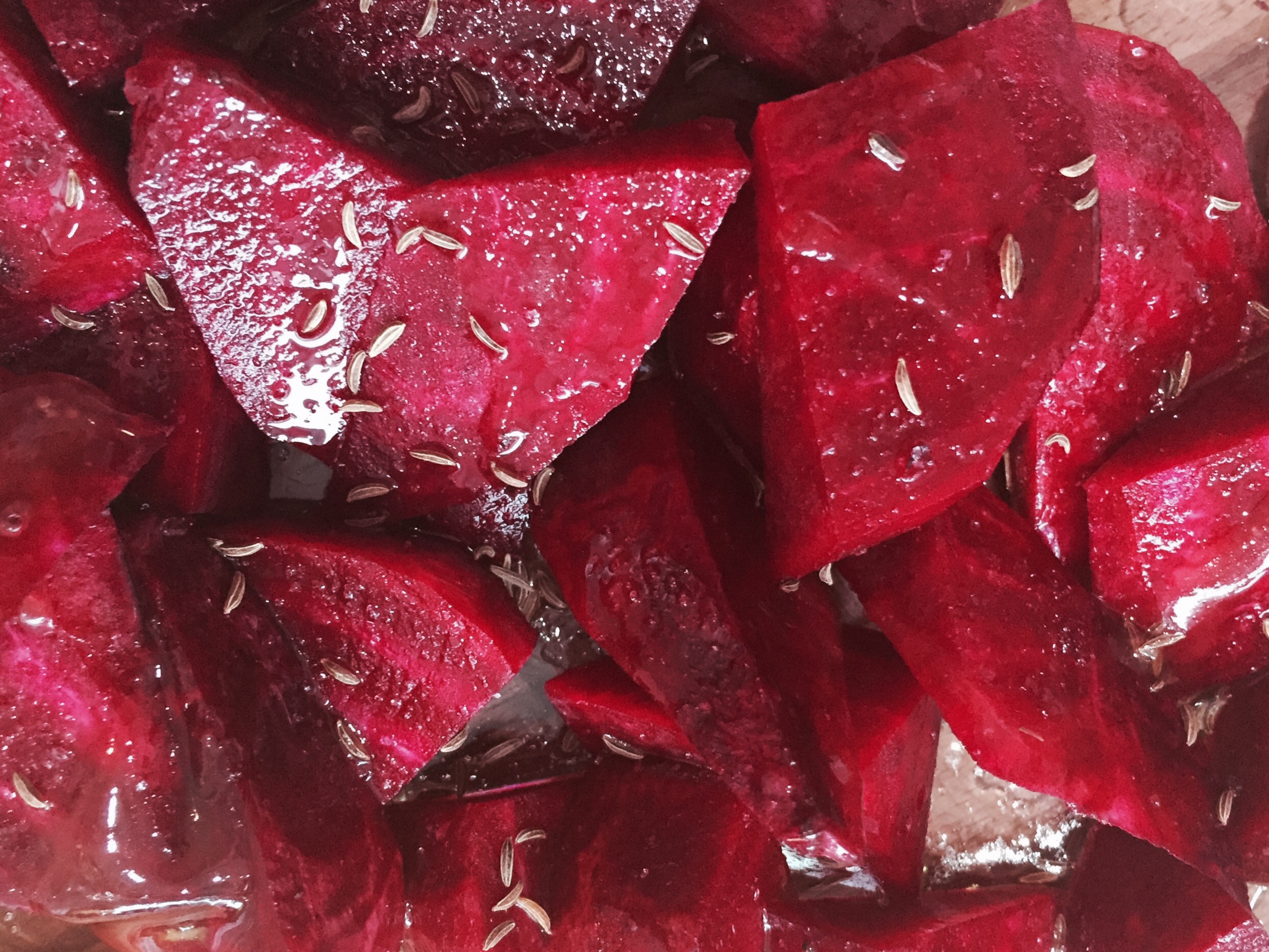 Randen schälen und in Spalten schneiden. In einer Ofenform mit Kümmel, Olivenöl, Salz und Honig mischen.