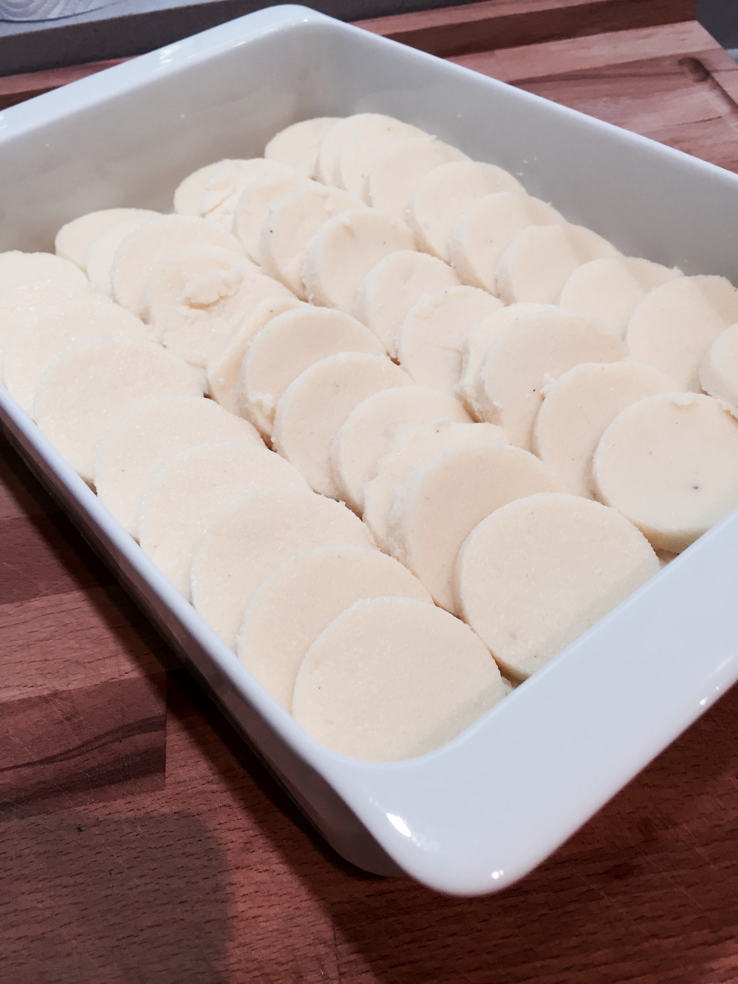Die Polenta zu einer ca. 1 cm dicken Platte ausstreichen. Ich mache es immer auf der nassen Arbeitsfläche mit einer nassen Spachtel.