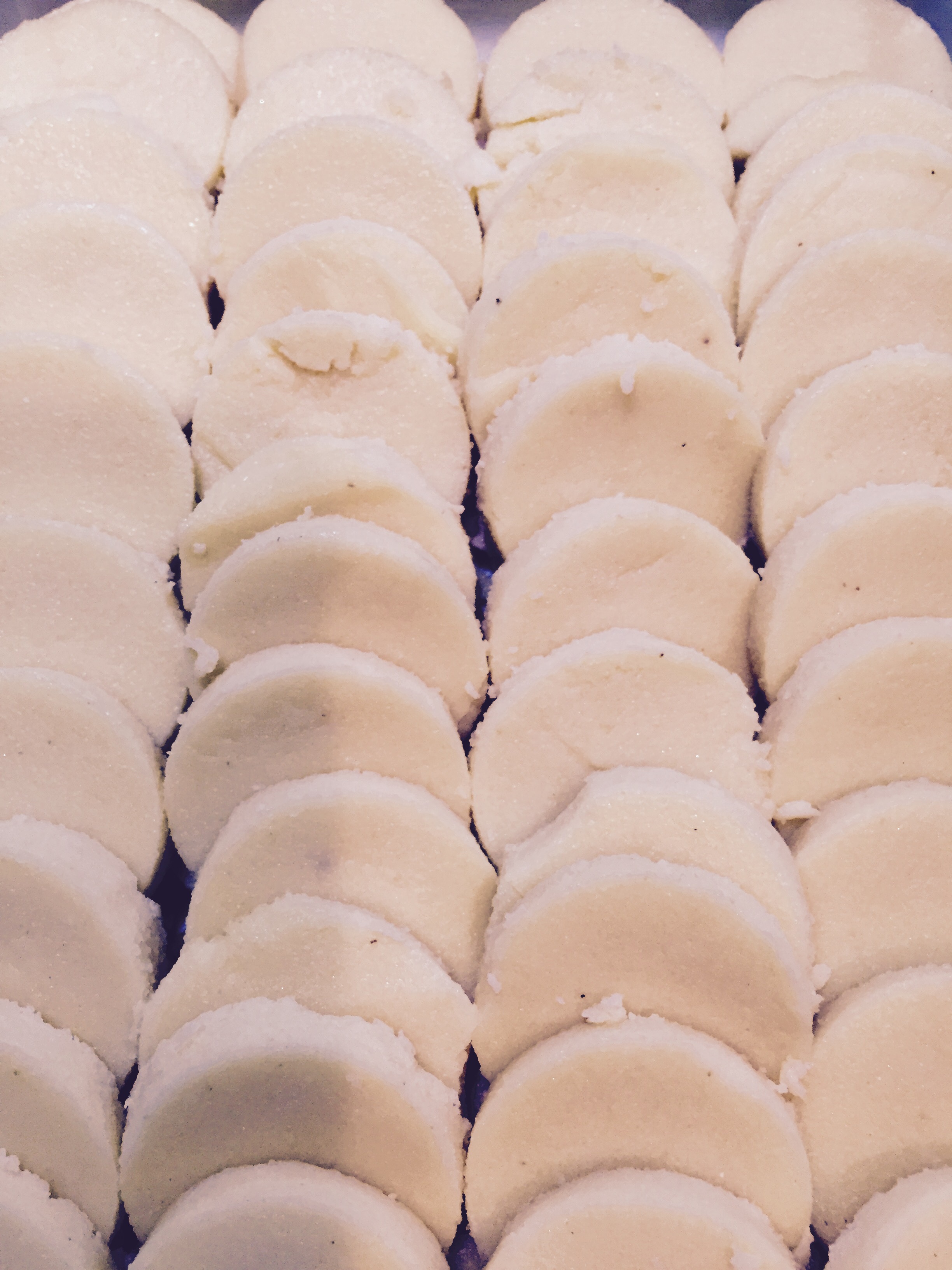 Mit einen runden Austecher(z.B. ein Glas) von ca. 3 cm Durchmesser Thaler ausstechen und in einer Ofenform anrichten.