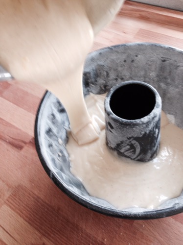 Die Gugelhupf-Form einölen und mit Mehl dünn bestäuben.