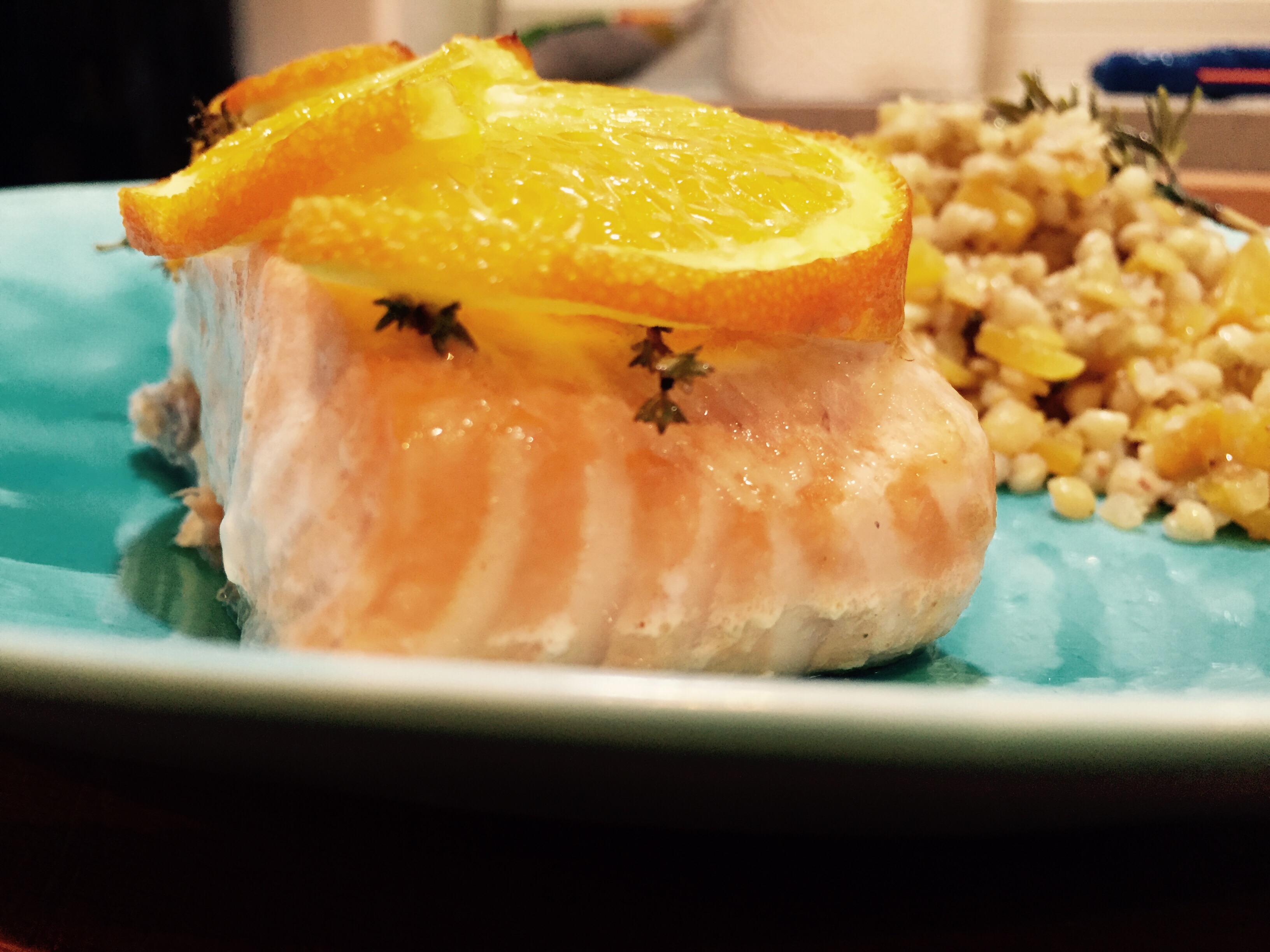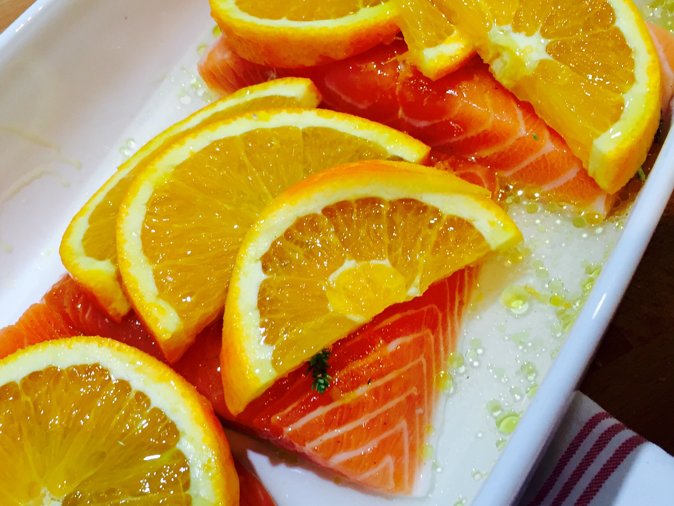 Einige Thymianzweige auf jedes Filet geben und mit Orangenabrieb bestreuen und anschliesend mit Orangenscheiben belegen und ein halbes Glas Weisswein dazugiesen.
