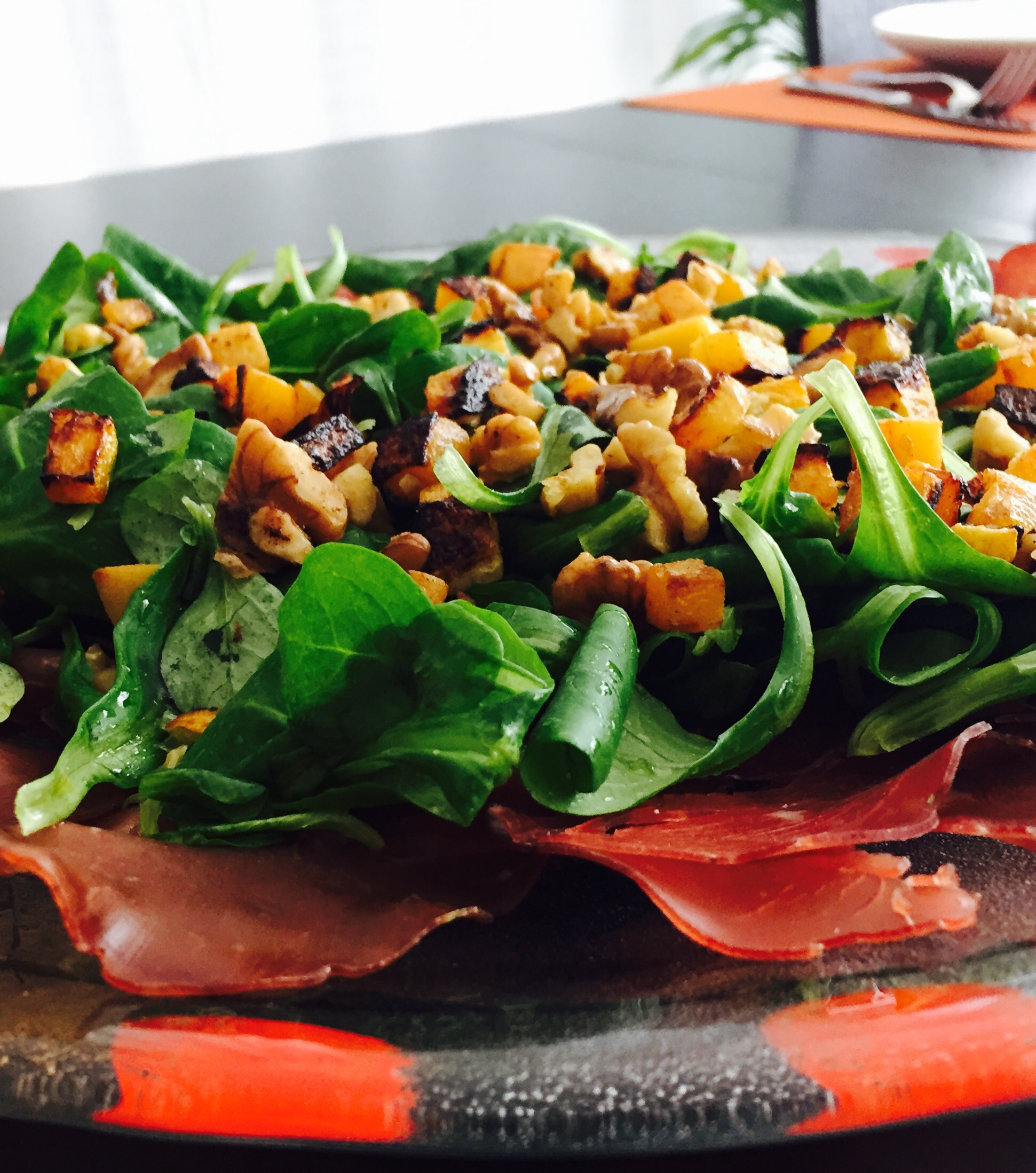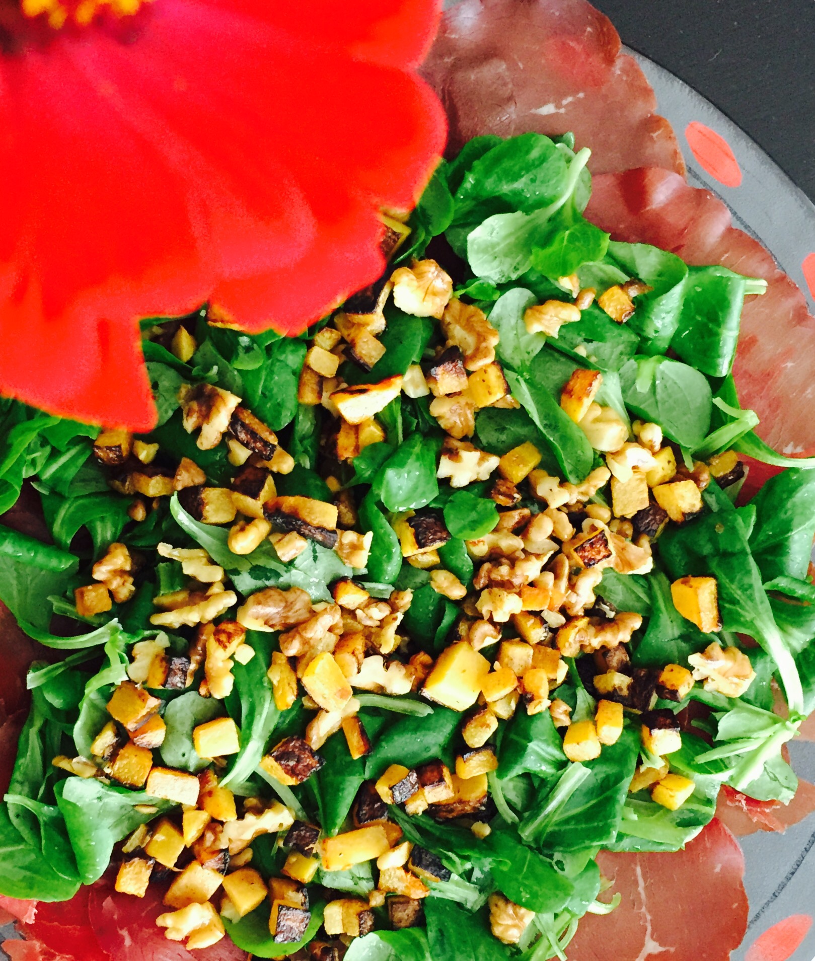 Die Kürbis Walnussmischung über Salat ind Bresaola verteilen.