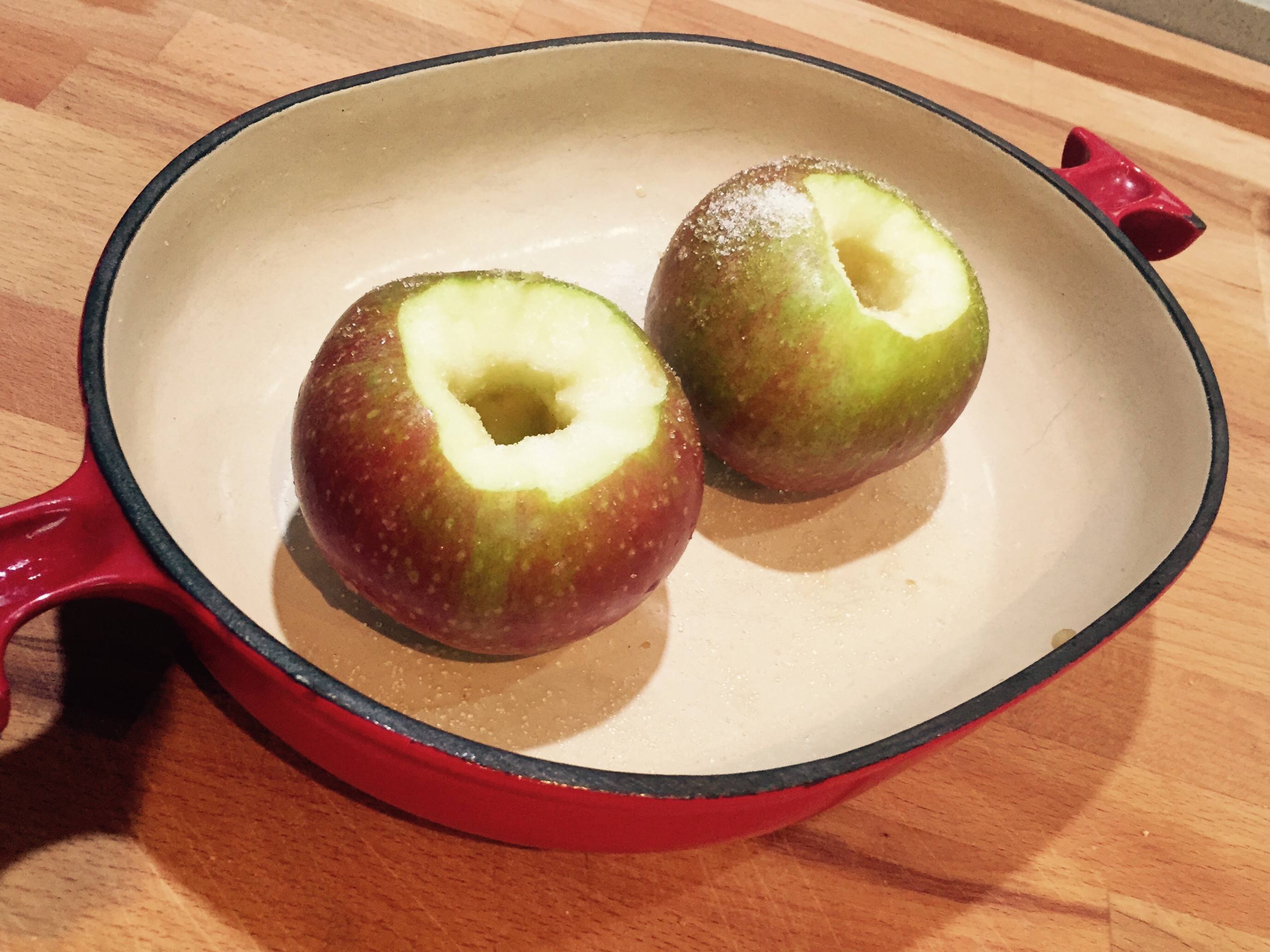 Die Äpfel entkernen, etwas aushöhlen und mit Zucker bestreuen.