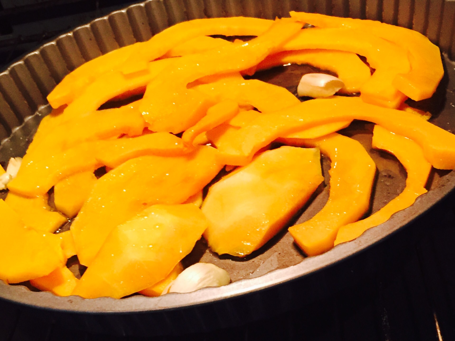 Den Kürbis in einer Auflaufform mit Salz, Olivenöl und einer zerdrückter Knoblauchzehe im Ofen bei 200 Grad weich garen.
