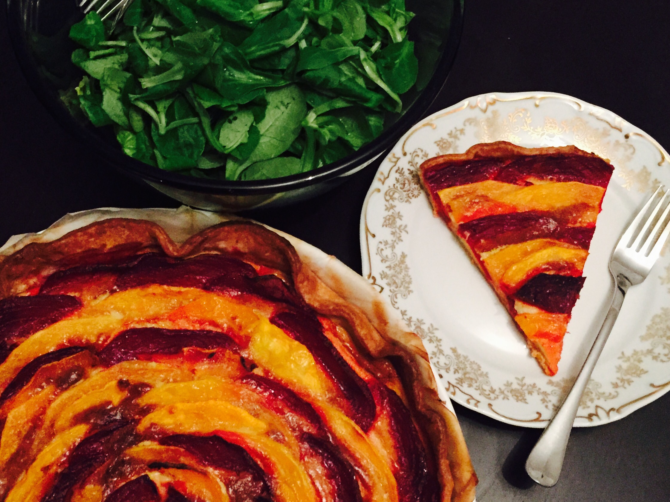 Nach dem Blindbacken die Käse-Eiersahne in die Form giessen und das Gemüse wie Blumeblätter auf die Sahne anrichten.