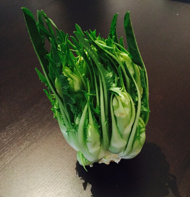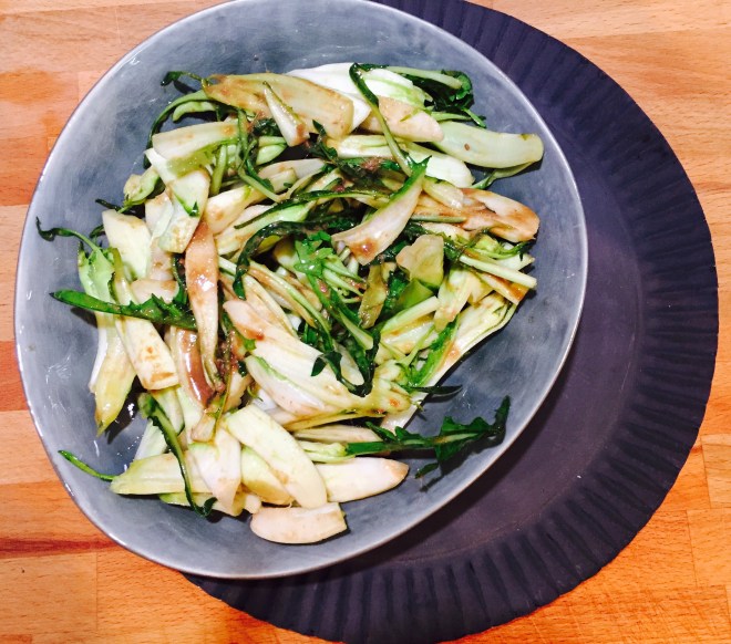 Sobald diese geschmolzen sind, die Puntarelle gut abtropfen und im Topf mit dem Sardellen-Olivenöl schwenken und servieren.