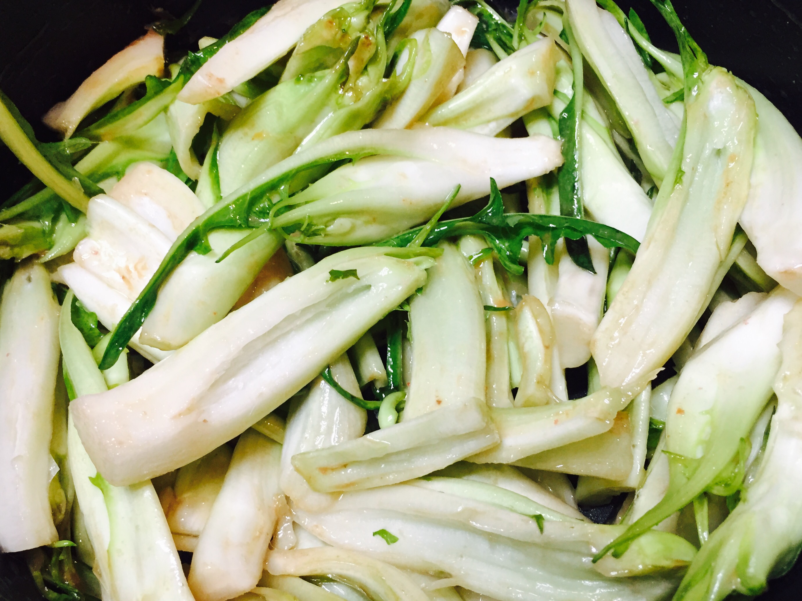 Sobald diese geschmolzen sind, die Puntarelle gut abtropfen und im Topf mit dem Sardellen-Olivenöl schwenken und servieren.