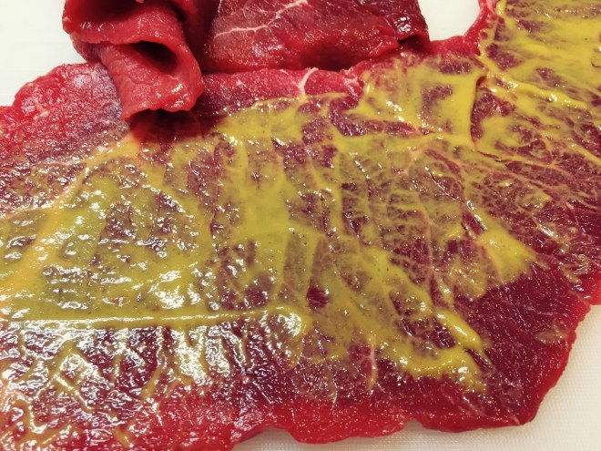 Die Rindsrouladen etwas klopfen damit sie nicht zu dick sind. Salzen, mit dem Honigsenf bestreichen und die Speckscheiben darauf verteilen.