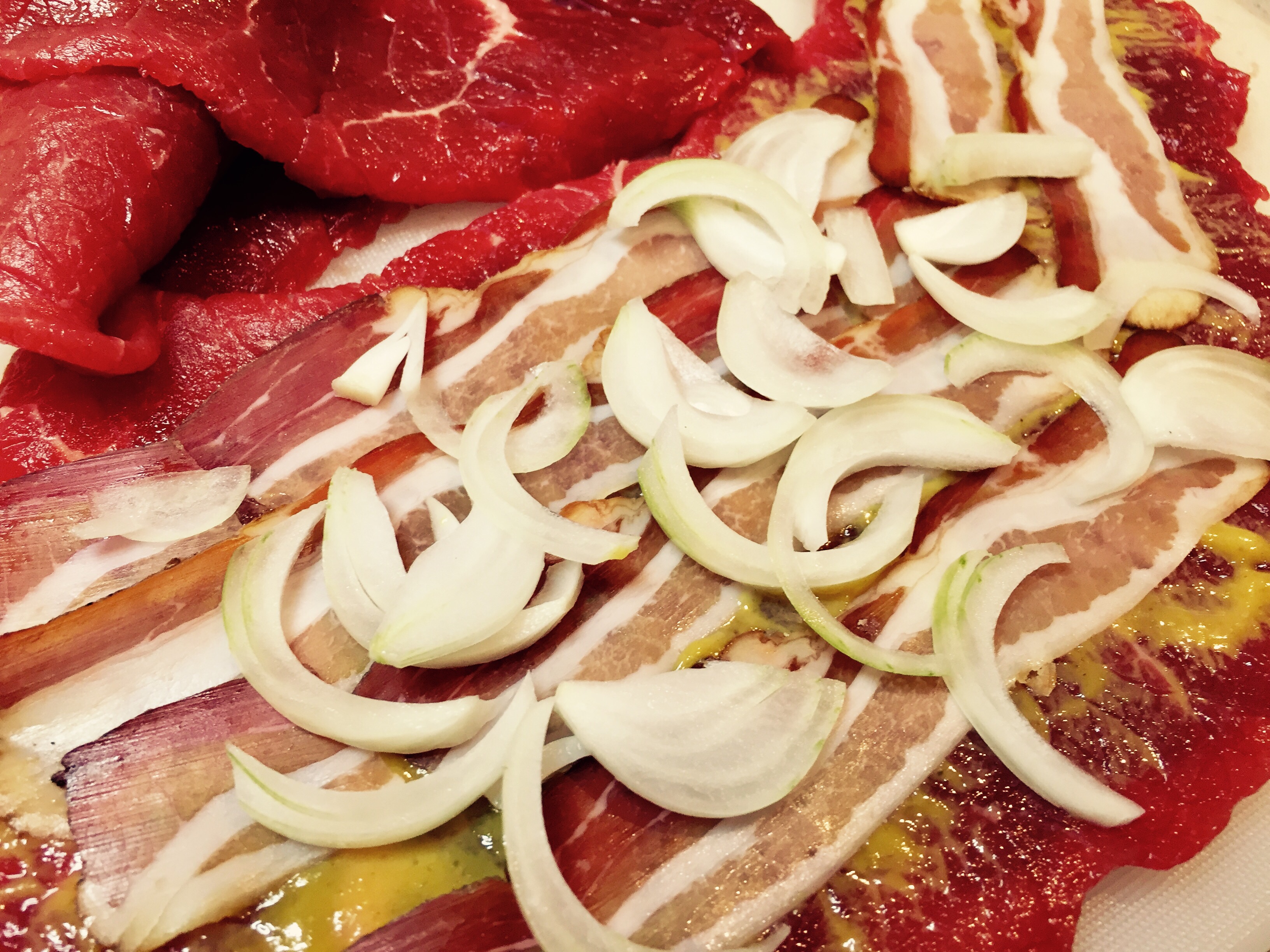 Die Rindsrouladen etwas klopfen damit sie nicht zu dick sind. Salzen, mit dem Honigsenf bestreichen und die Speckscheiben darauf verteilen.