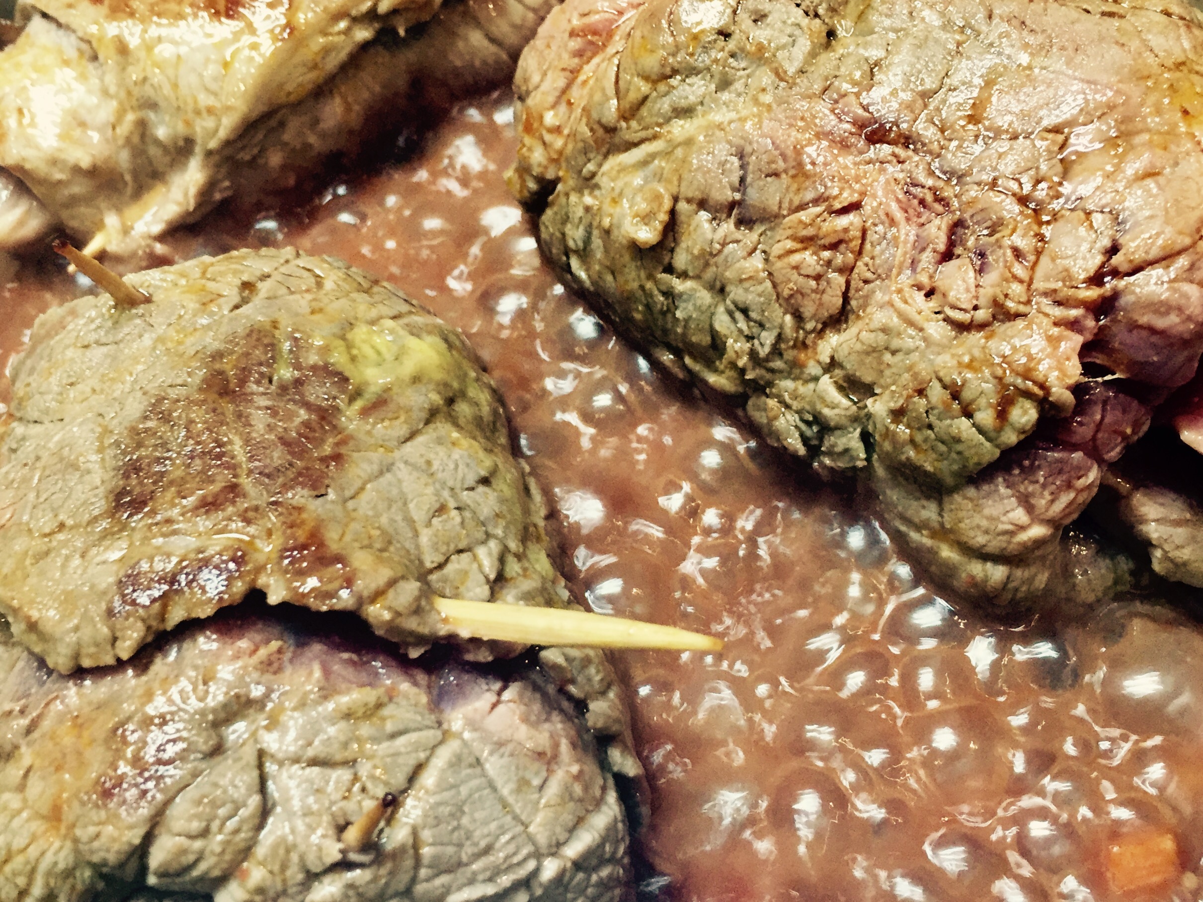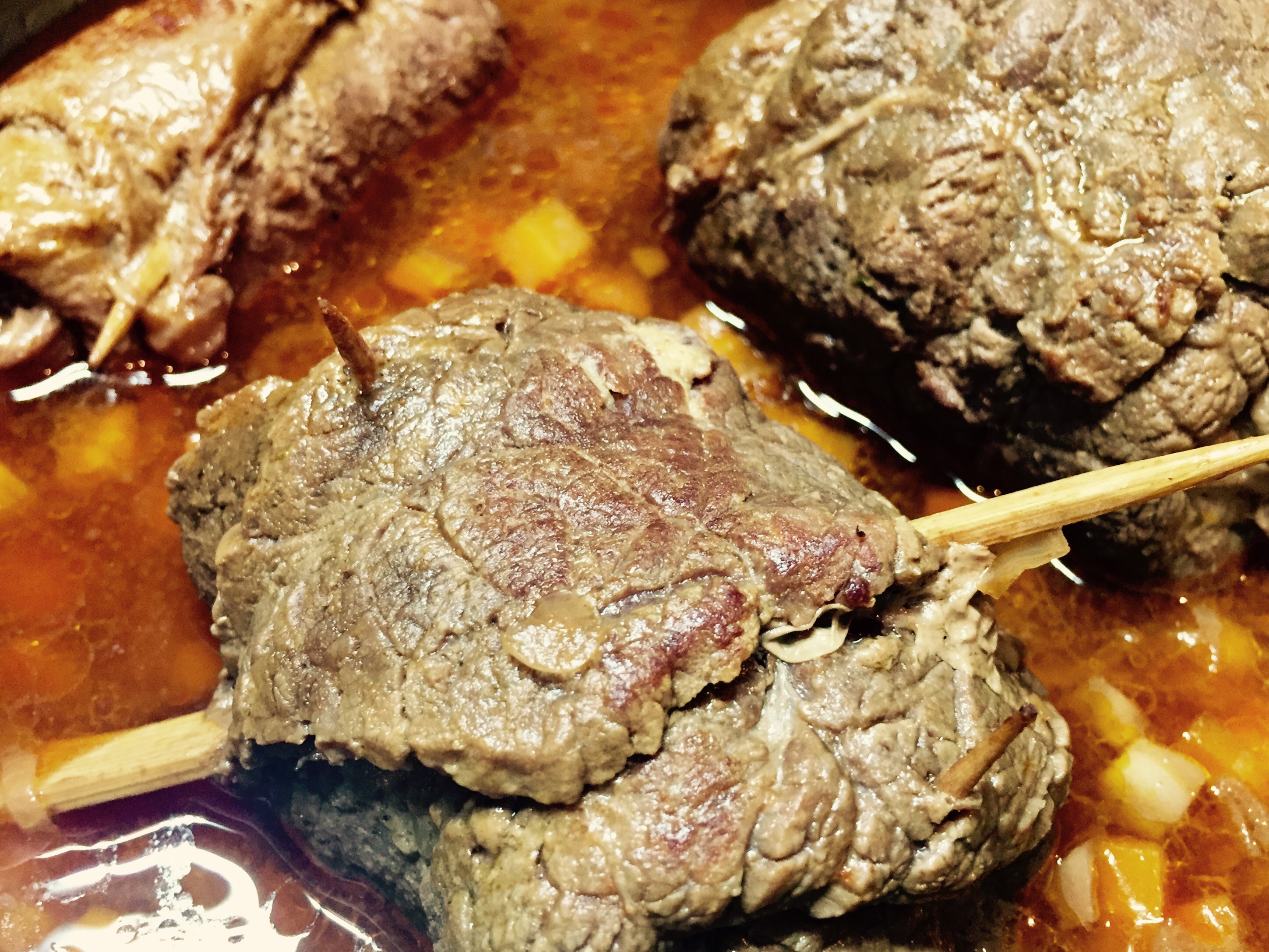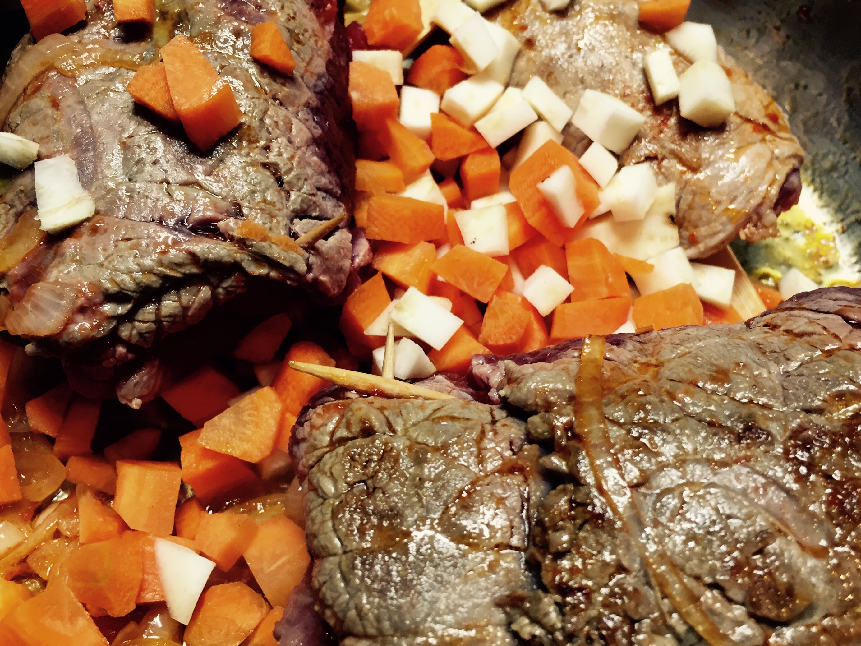 Die andere Zwiebel würfeln und in Olivenöl Extra Vergine zusammen kot den Rouladen scharf anbraten. Tomatenmark und restliches Gemüse gewürfelt dazugeben und mitrösten. Mit Rotwein löschen und etwas einkochen lassen. Mit 150 ml Brühe übergiesen und im Schnellkochtopf gute 20-30 Minuten garen.