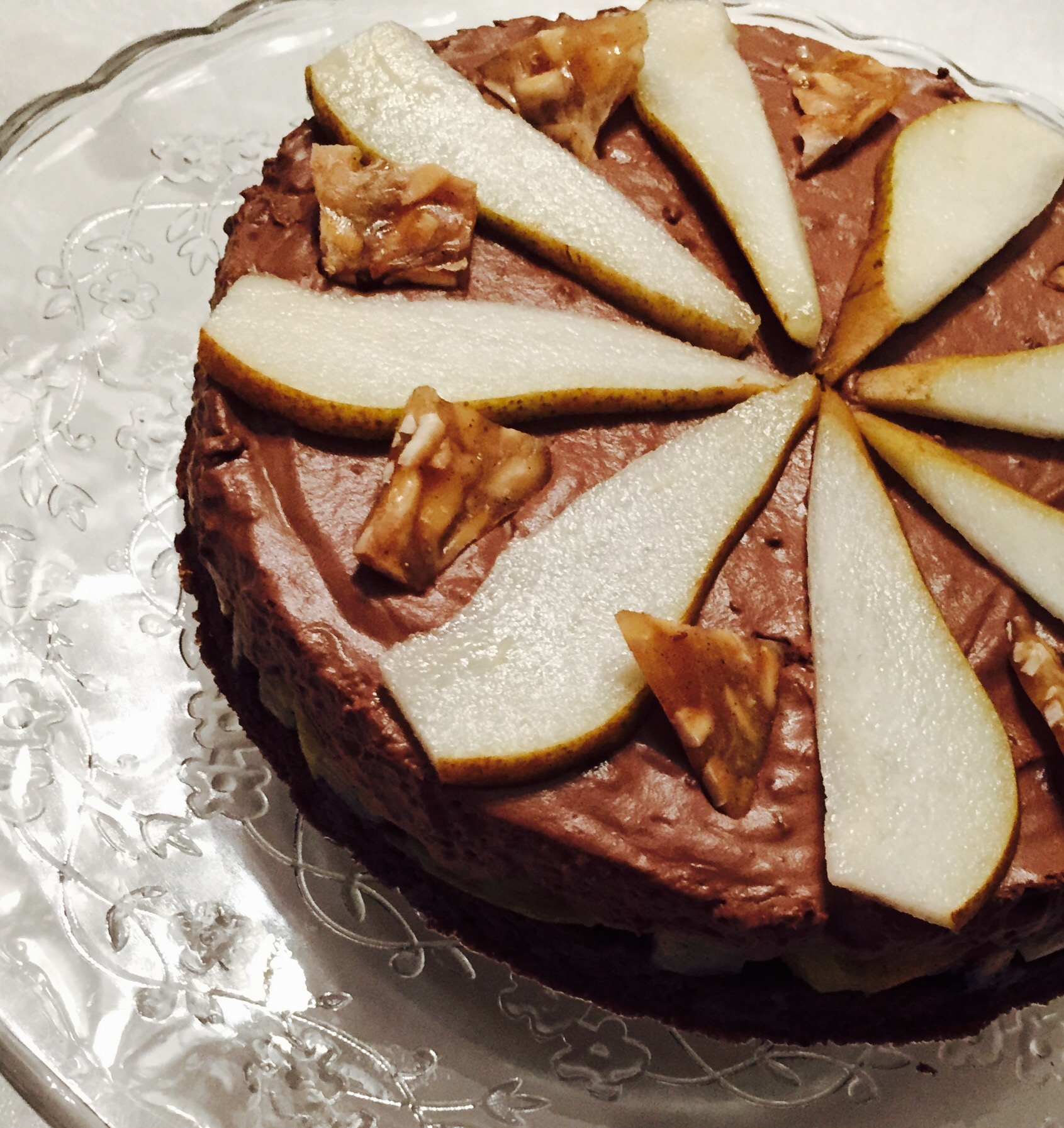 Für den Boden eine 2 cm dicke Scheibe vom Biskuit in die Springform geben und mit dem beiseite gestellten Sud gut tränken. Die Birnen daraufgeben.