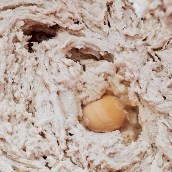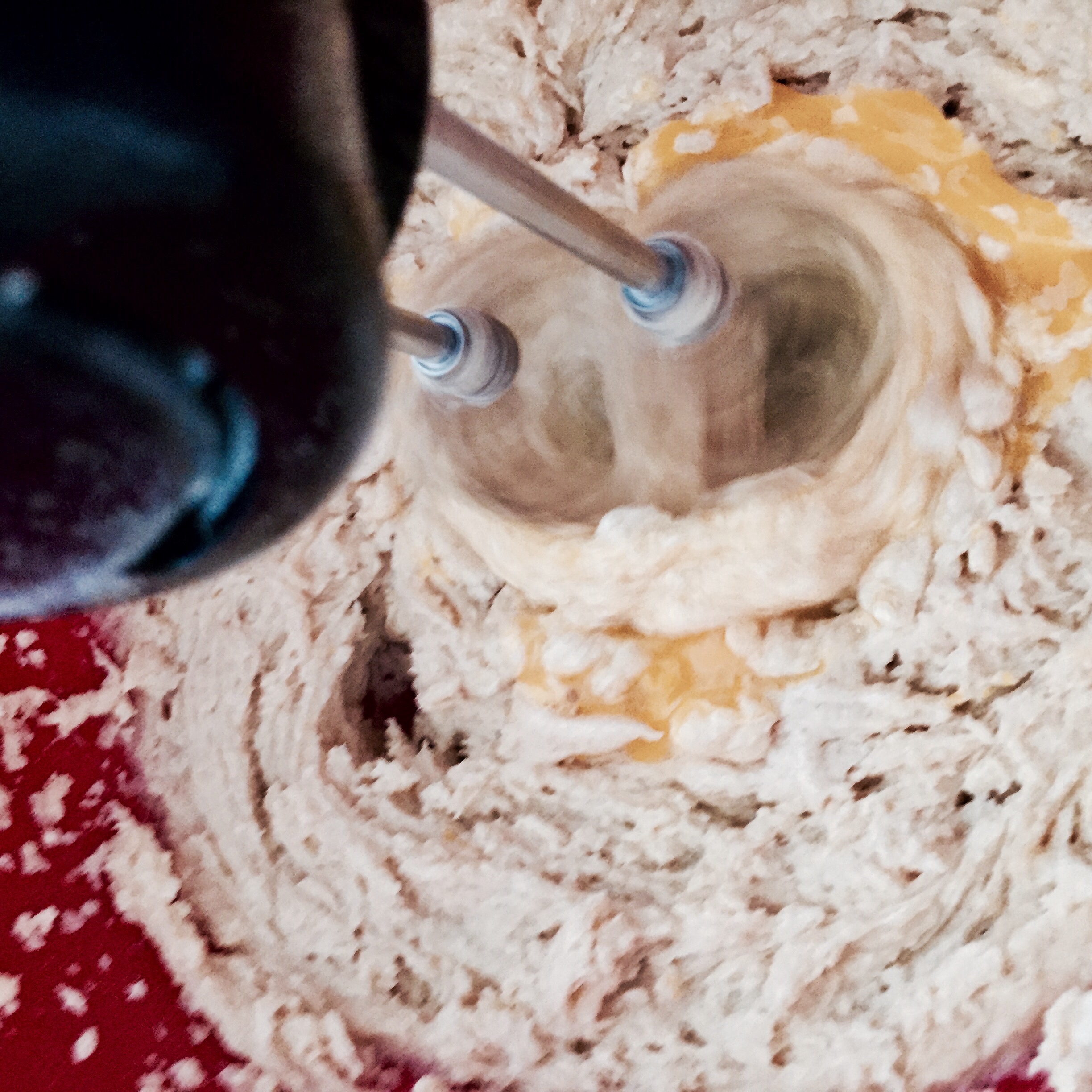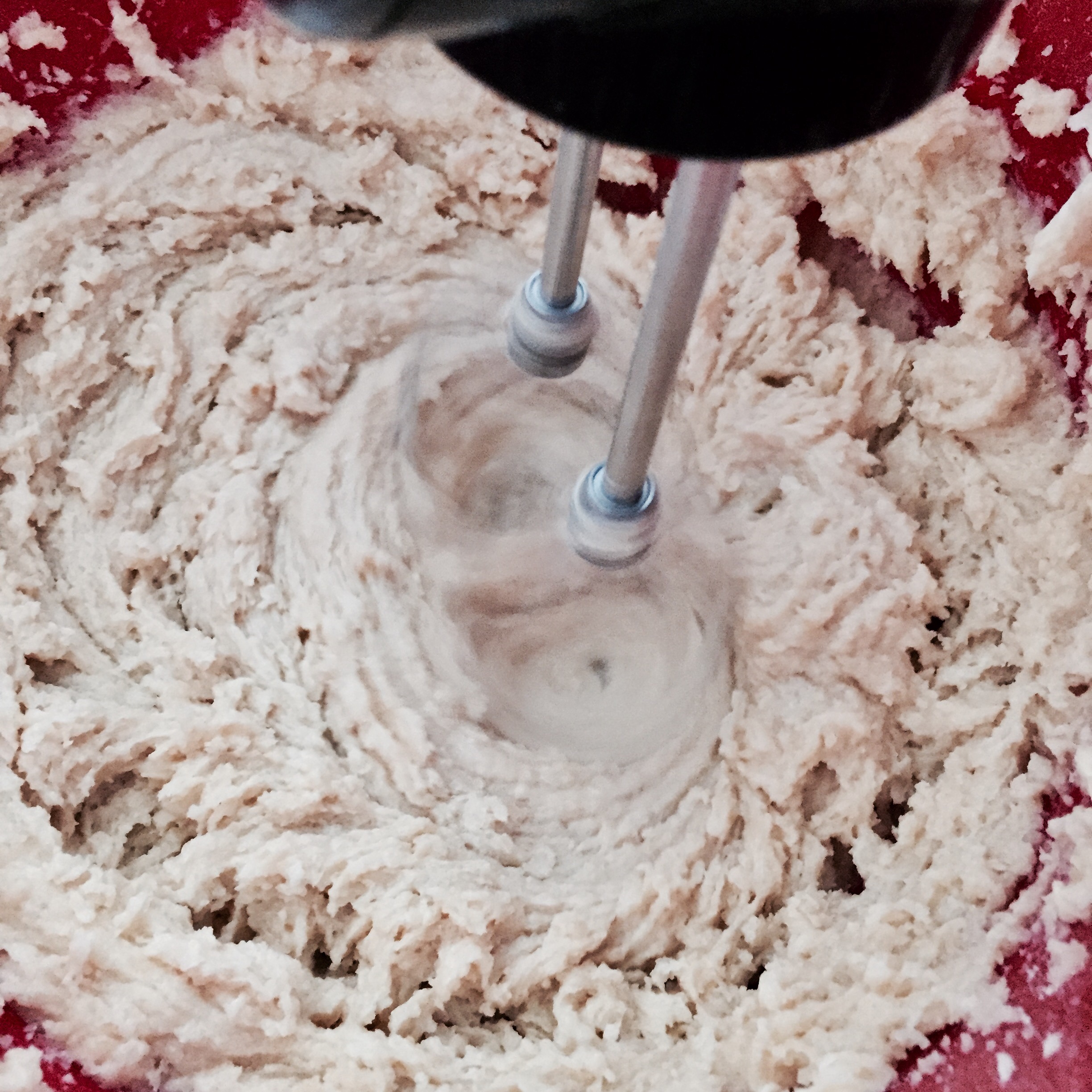 Die weiche Butter mit den beiden Zuckern schaumig aufschlagen, die Eier nach einander unterrühren sowie das Vanilleextrat.