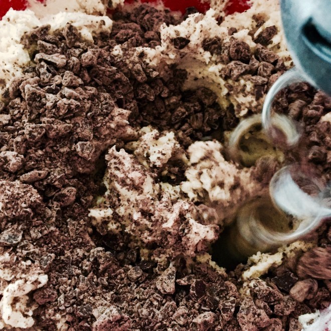 Das Mehl Löffelweise einarbeiten und zum Schluss die gehackte Schokolade, wer wünscht kann ebenso gehackte Makadamianüsse untermixen.