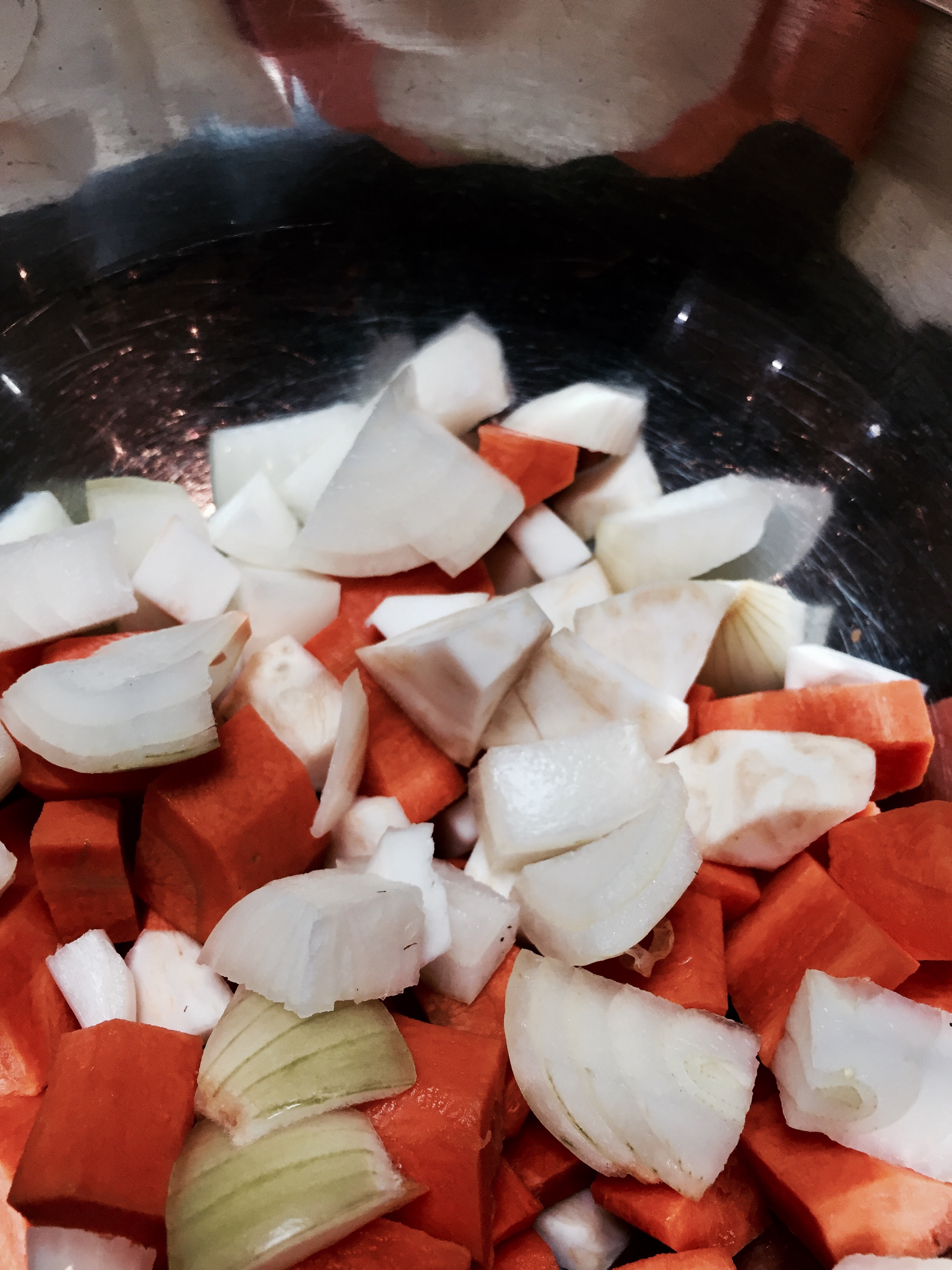 Sowohl das Fleisch als auch das Gemüse in Würfel schneiden.