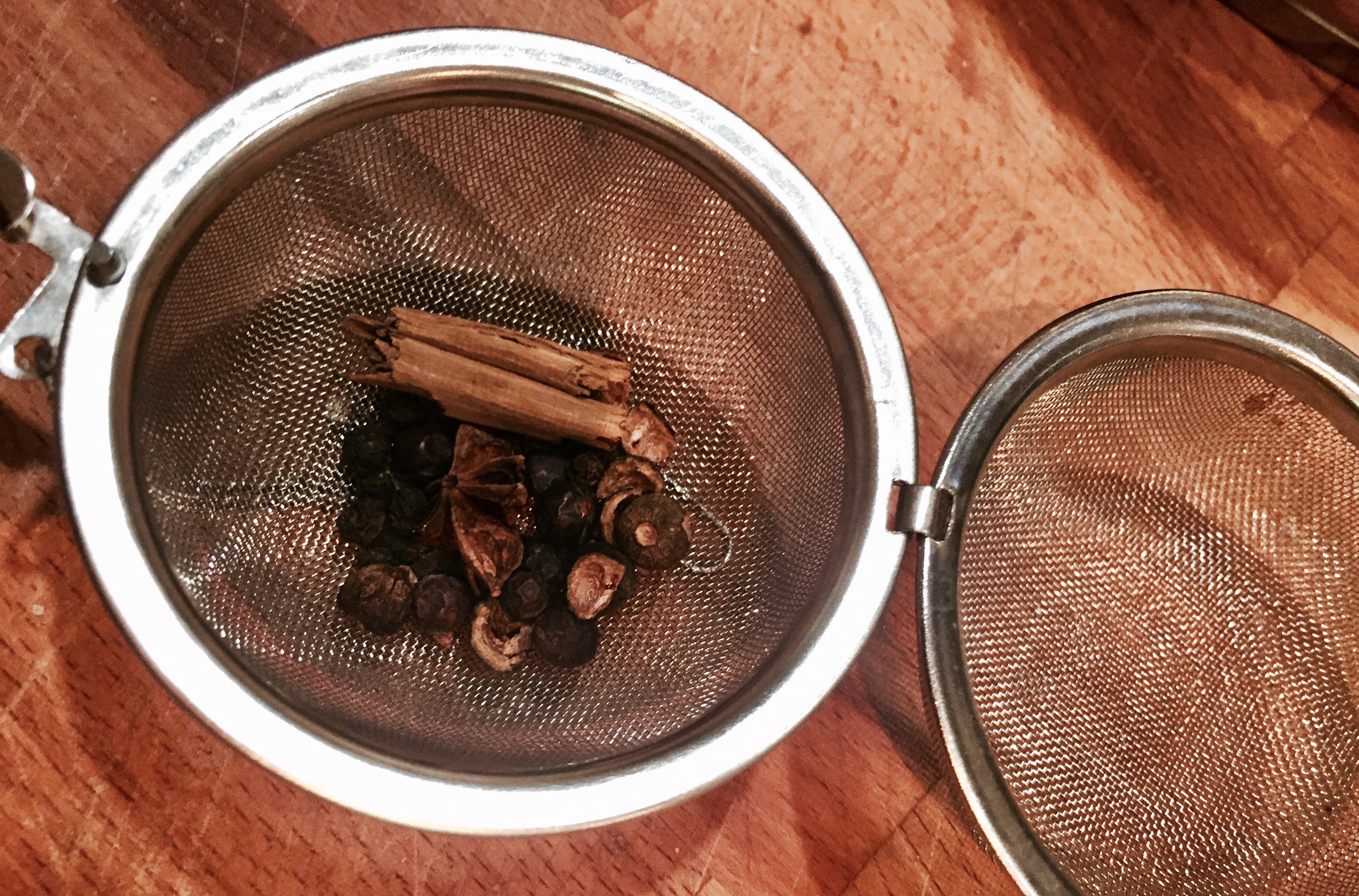 1 Lobeerblatt, 5 Pigmentkörner, 3 Wacholderbeeren, einige Zimtsplitter, 1/2 Anisstern und eine 1/2 Vanilleschote