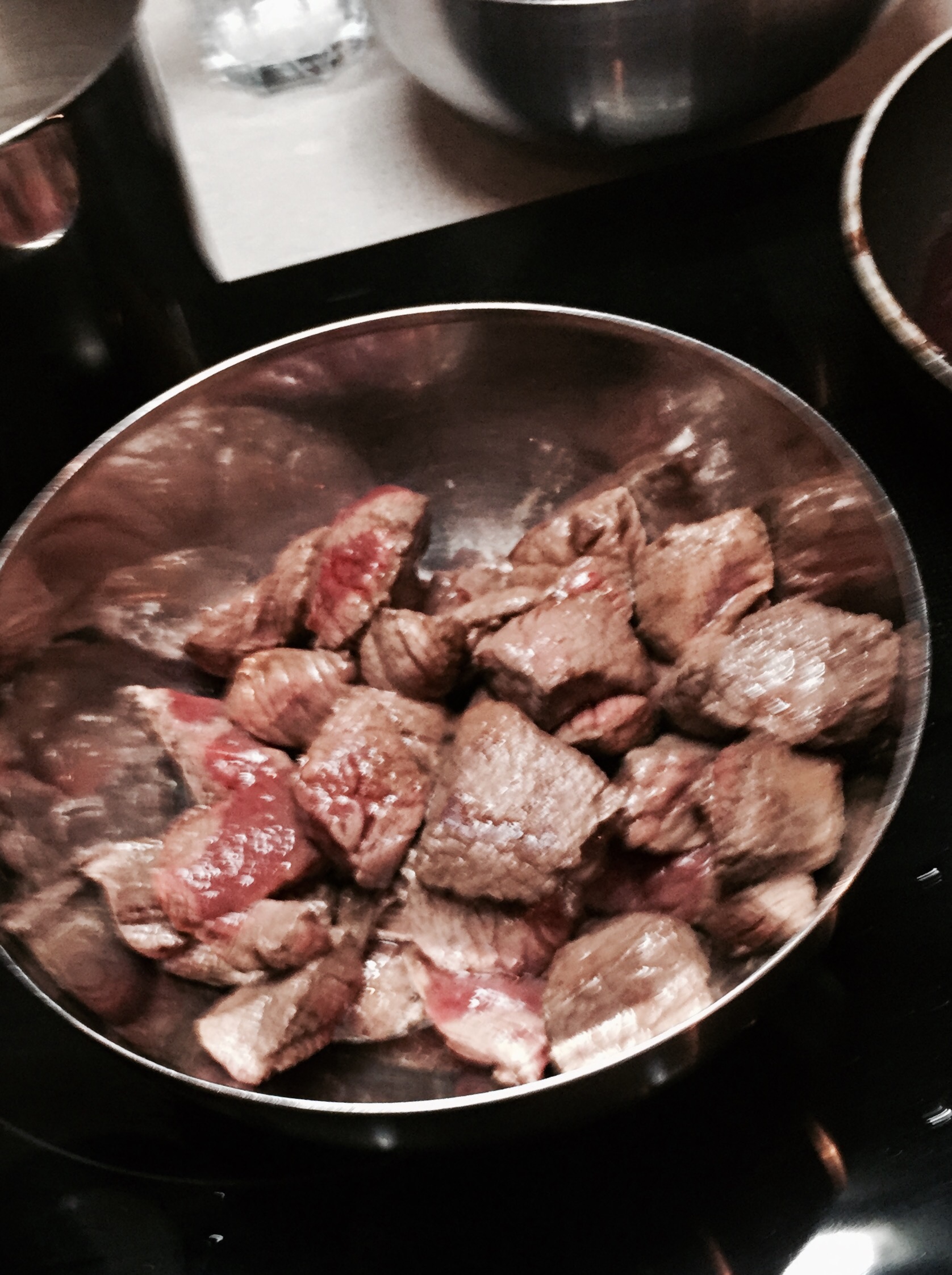In einer Pfanne portionsweise in Olivenöl scharf anbraten und beiseite legen. Den Bratensatz mit dem halben Glas Rotwein löschen und einkochen lassen.