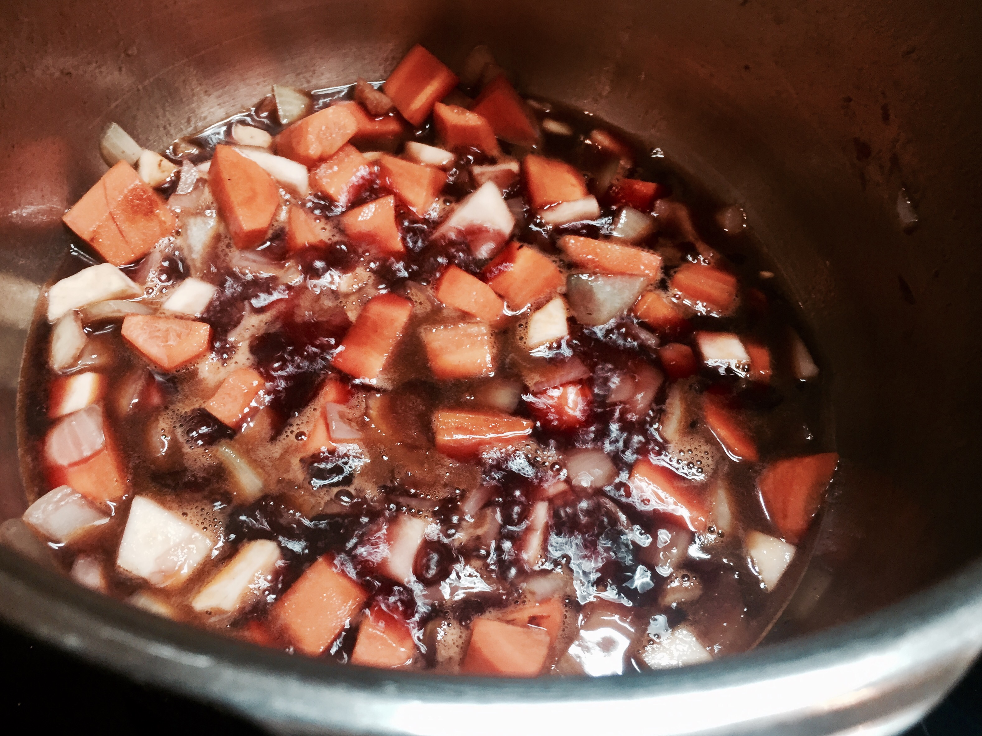 In der Zwischenzeit das Gemüse in Olivenöl andünsten, mit Puderzucker bestäuben und leicht karamallisieren lassen. Das Tomatenmark dazugeben und auch einige Minuten mitrösten. Mit dem restlichen Wein löschen und gut einkochen lassen.