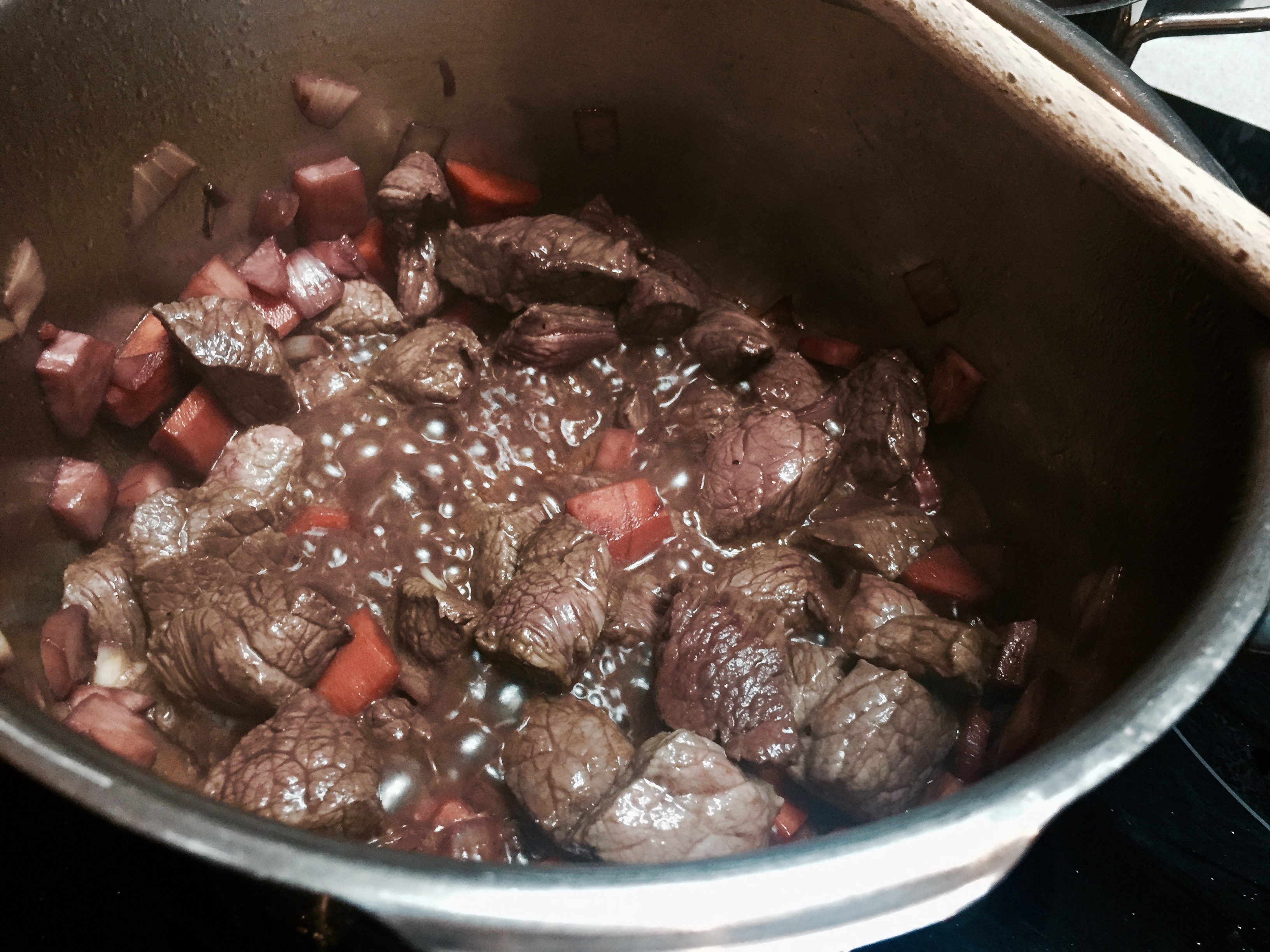 Das Fleisch dazugeben und den Fond und den Bratensatz angiessen.