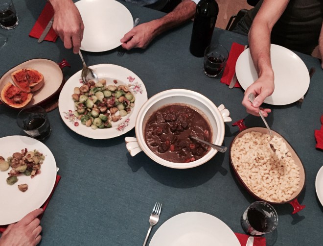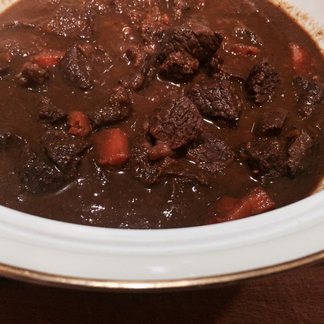 Das Gulasch ca. 2 Stunden köcheln lassen (oder im Schnellkochtopf 10 Minuten).