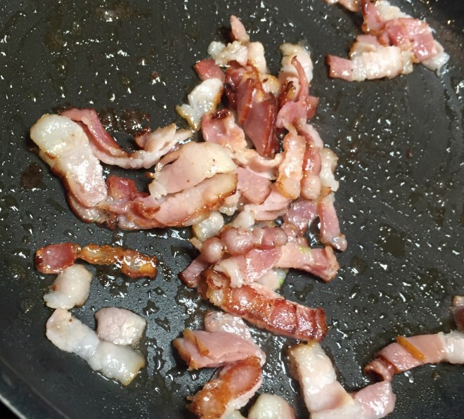 In einer Pfanne den in Streifen geschnittenen Bratspeck anbraten bis das Fett leicht schmilzt.