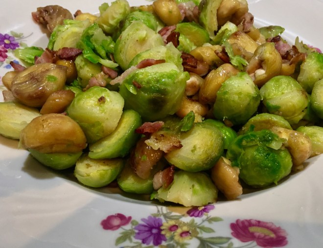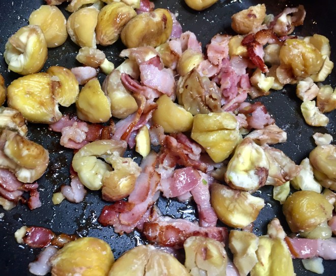 Die grob gehackten Kastanien und den in Hälften geschnittenen Rosenkohl dazugeben und mit etwas Olivenöl schwenken.