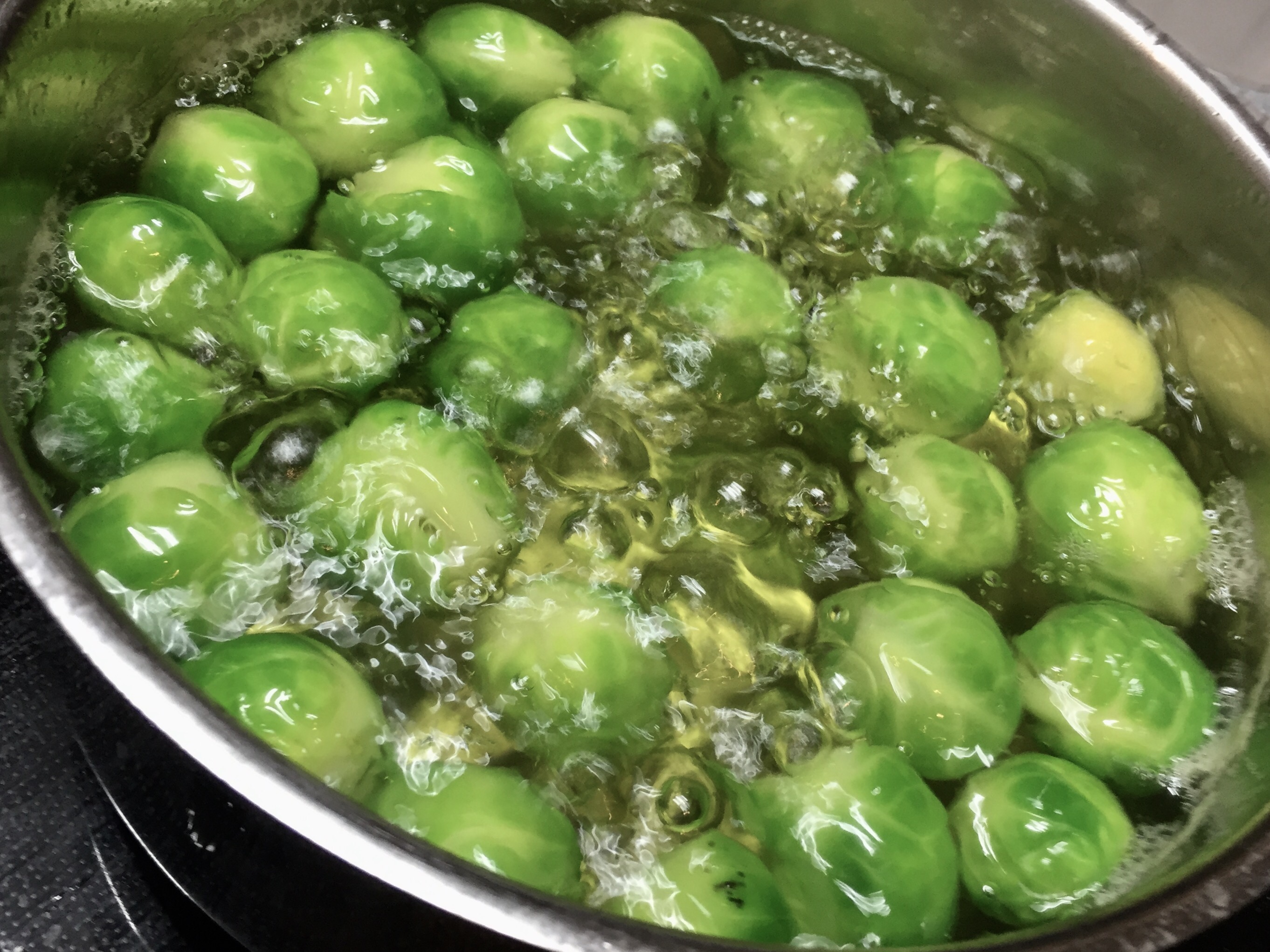 In der Zwischenzeit den Rosenkohl von den äusseren Blättern befreien, den Strunk dünn abschneiden und im kochenden gesalzten Wasser bissfest garen (max. 10 Minuten). Dabei die grösseren Rösschen an der Schnittstelle kreuzförmig einschneiden.