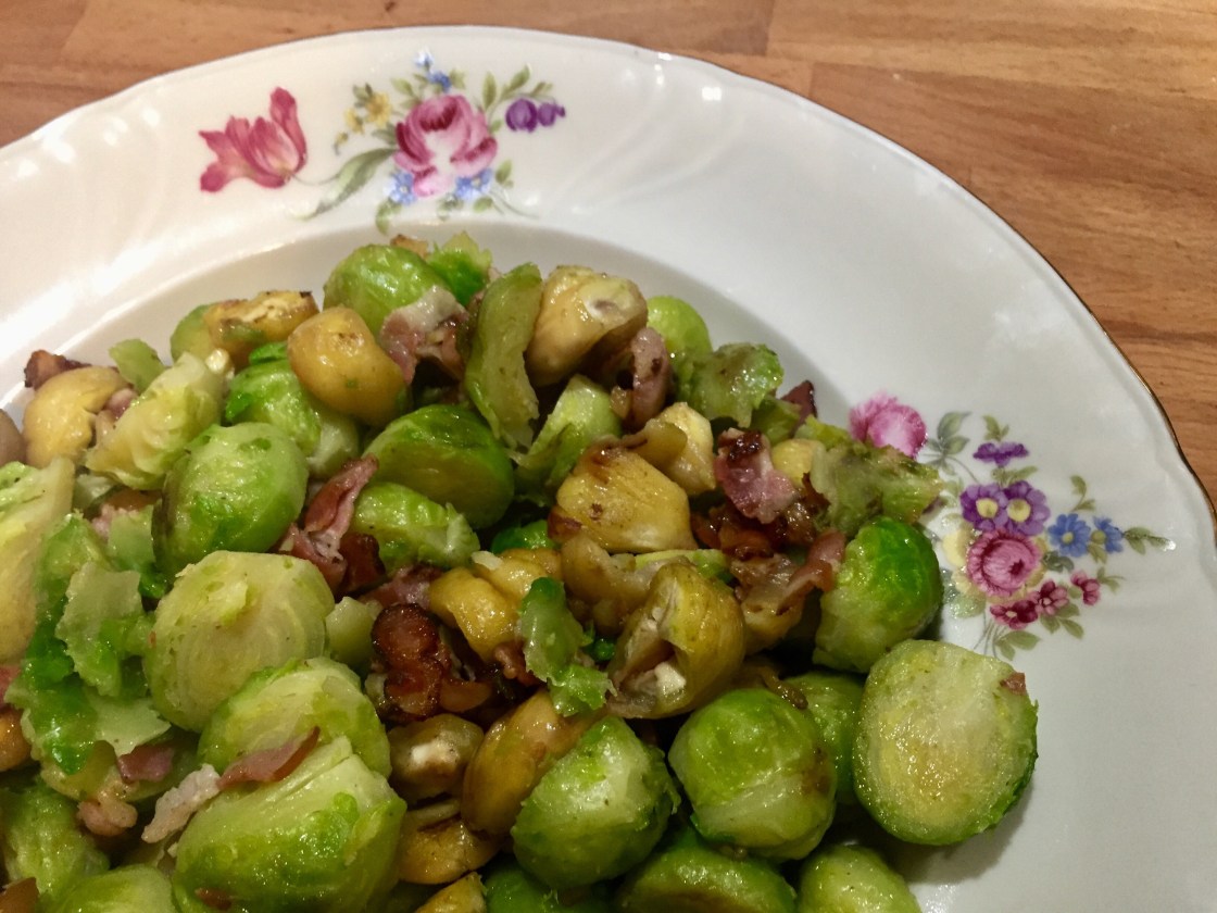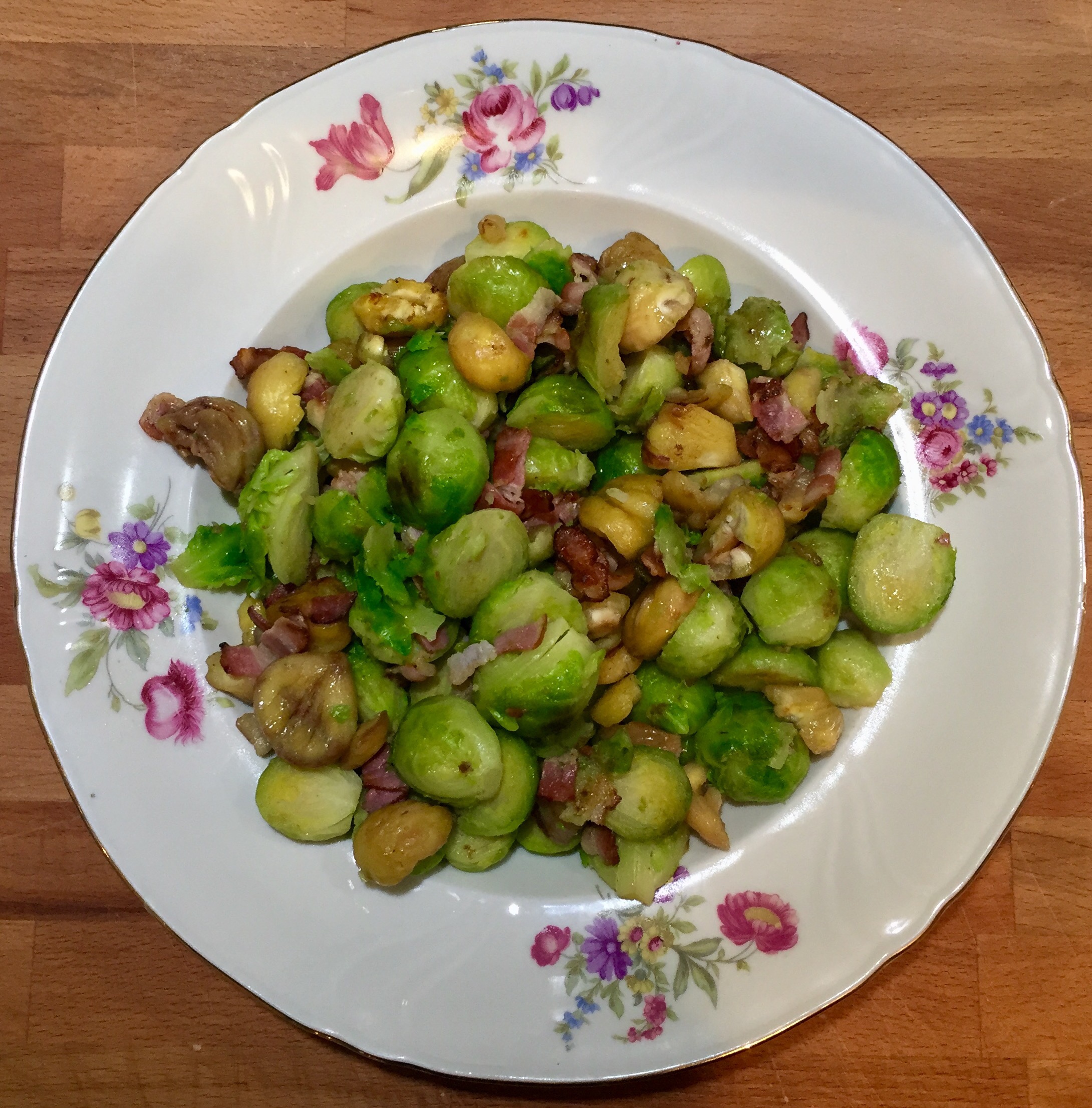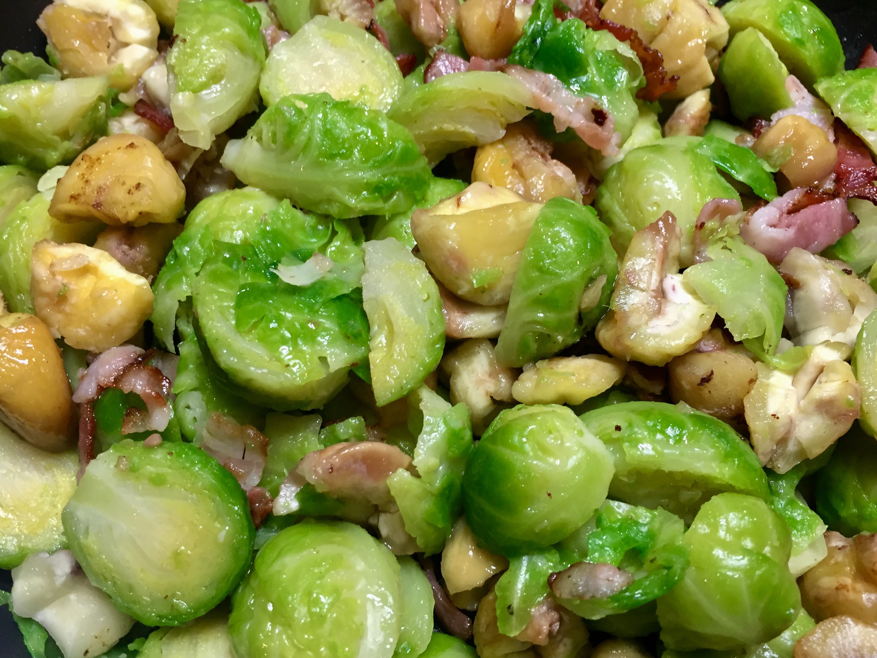 Die grob gehackten Kastanien und den in Hälften geschnittenen Rosenkohl dazugeben und mit etwas Olivenöl schwenken.