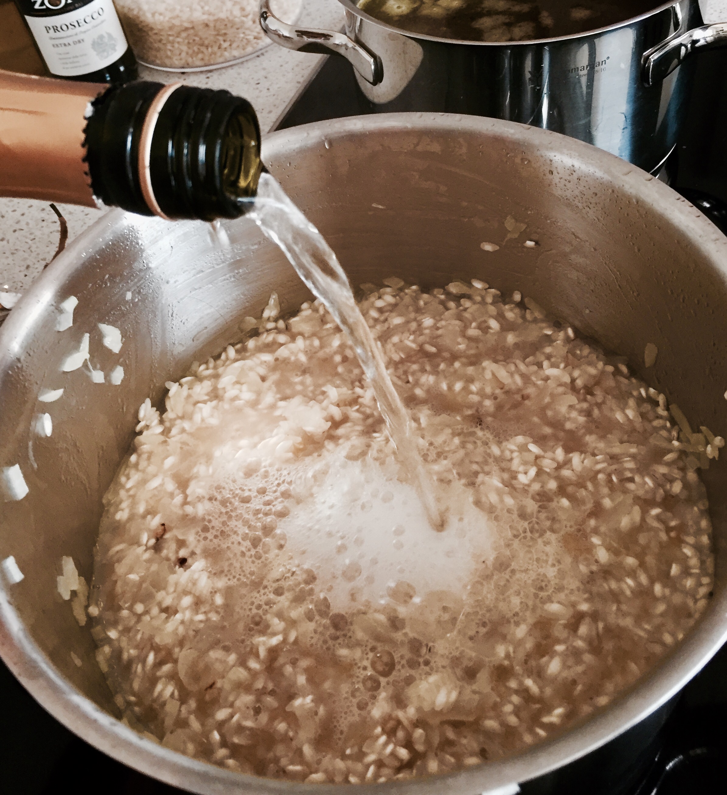 Mit dem restlichen Prosecco löschen und gut einkochen lassen. Dann kellenweise die Brühe zum Risotto geben und immer wieder einkochen lassen. Solange damit fortfahren bis der Reis die gewünschte Konsistenz hat.