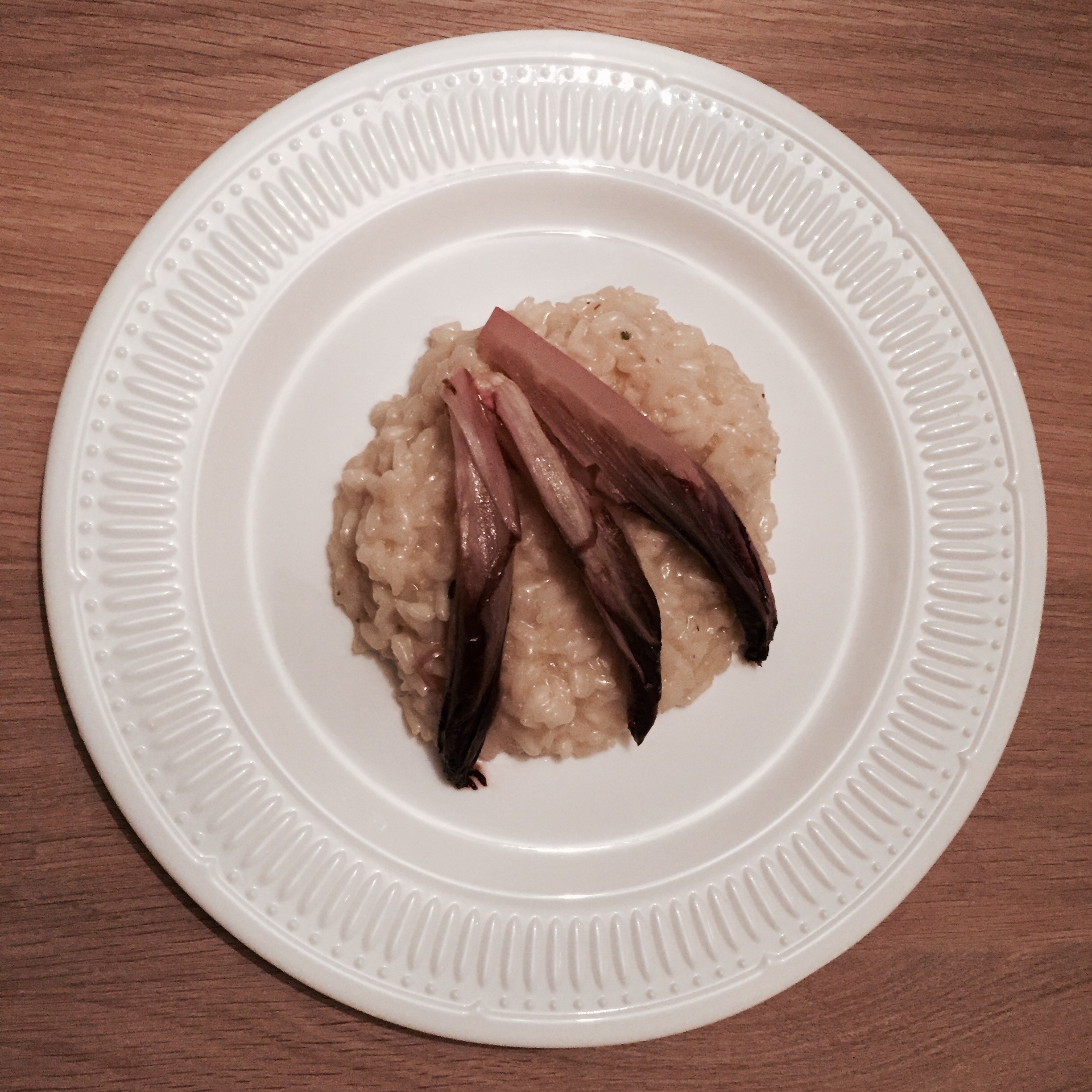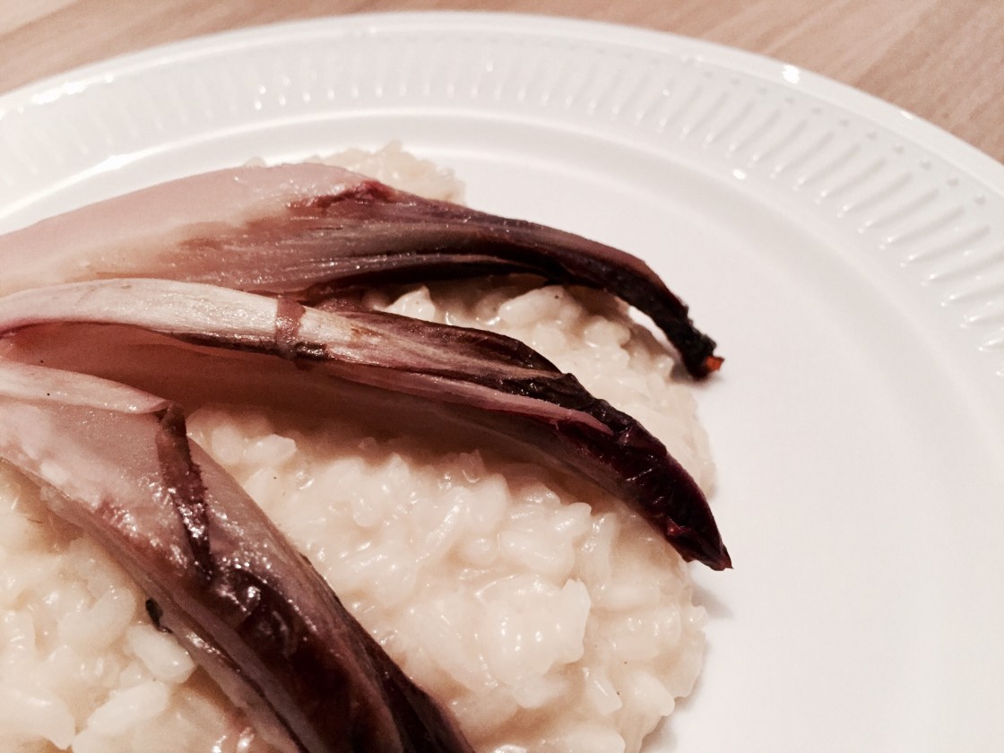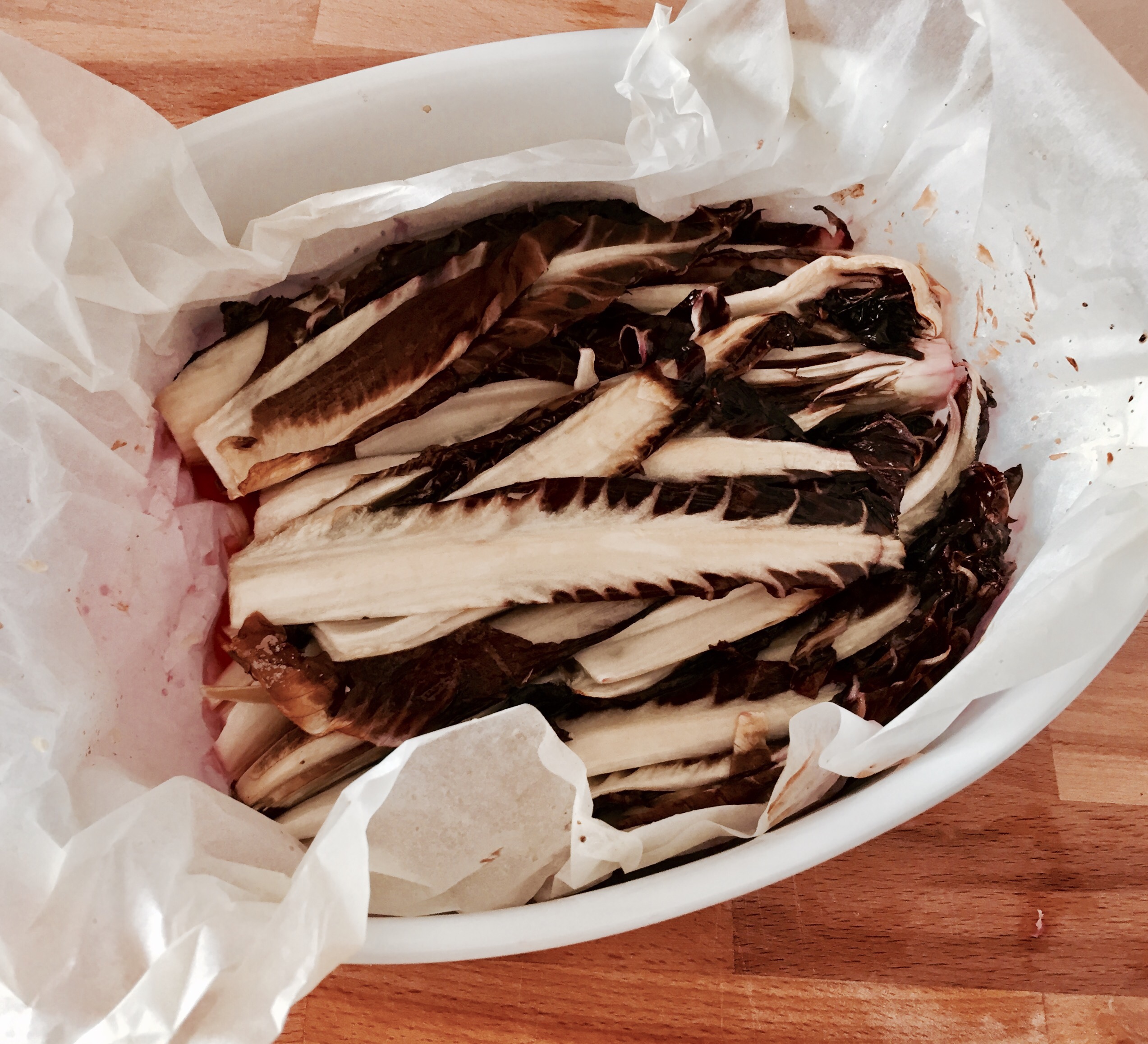 Den Radicchio vierteln und in eine mit Butterpapier (vorher nass machen) ausgelegt Form geben. 1 Glas Prosecco dazu giessen, salzen, mit Öl beträufeln und das Butterpapier zu einem Päckchen schliessen und bei 180 Grad 25 Minuten im Ofen garen.