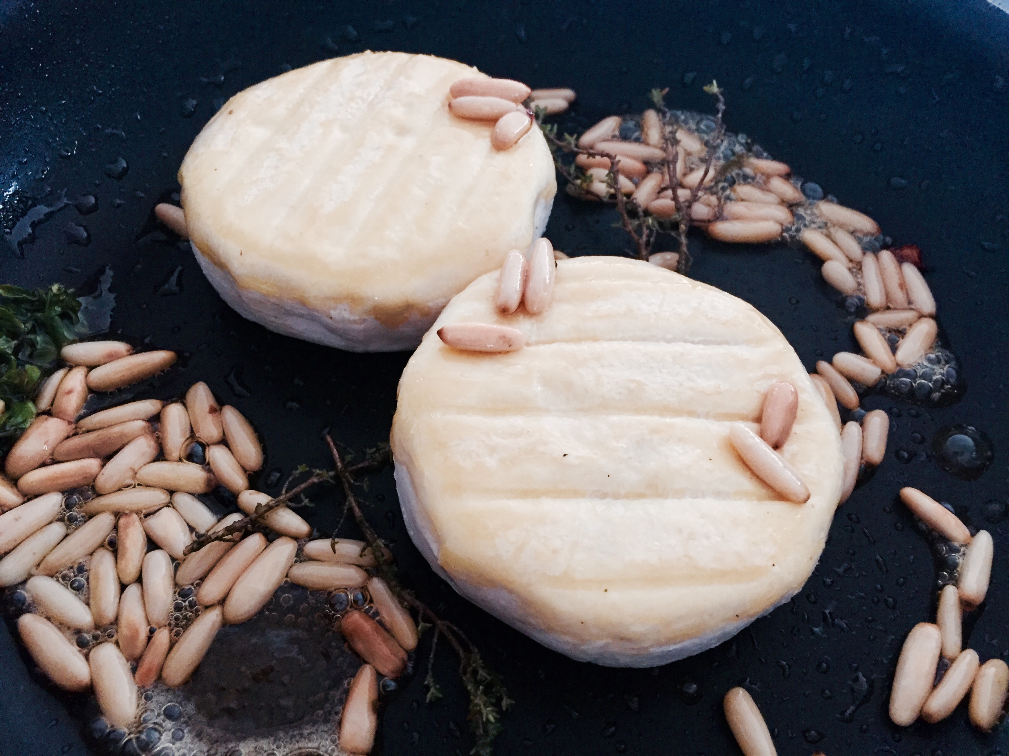 Die Temperatur senken und den Käse dazugeben, sowie die Pinienkerne mitrösten.