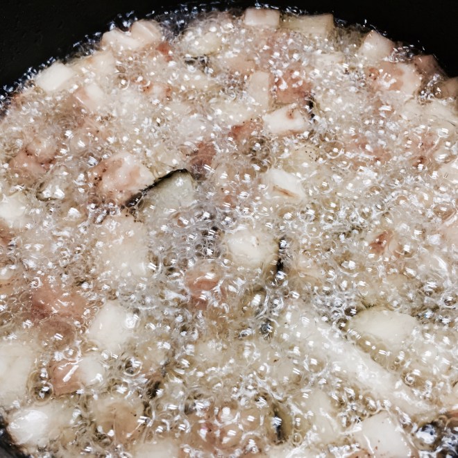 Als erstes die Melanzane in Würfel schneiden (ca.1-2 cm dick) und portionsweise in reichlich Frittieröl frittieren.