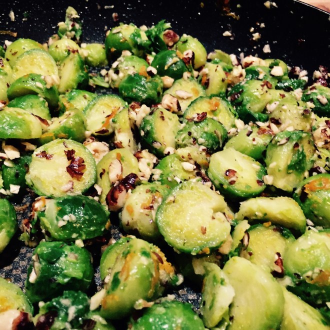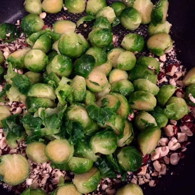In einer Pfanne die grobgehackten Haselnüsse rösten, etwas Olivenöl dazugeben sowie die halbierten Röschen und durchschwenken.