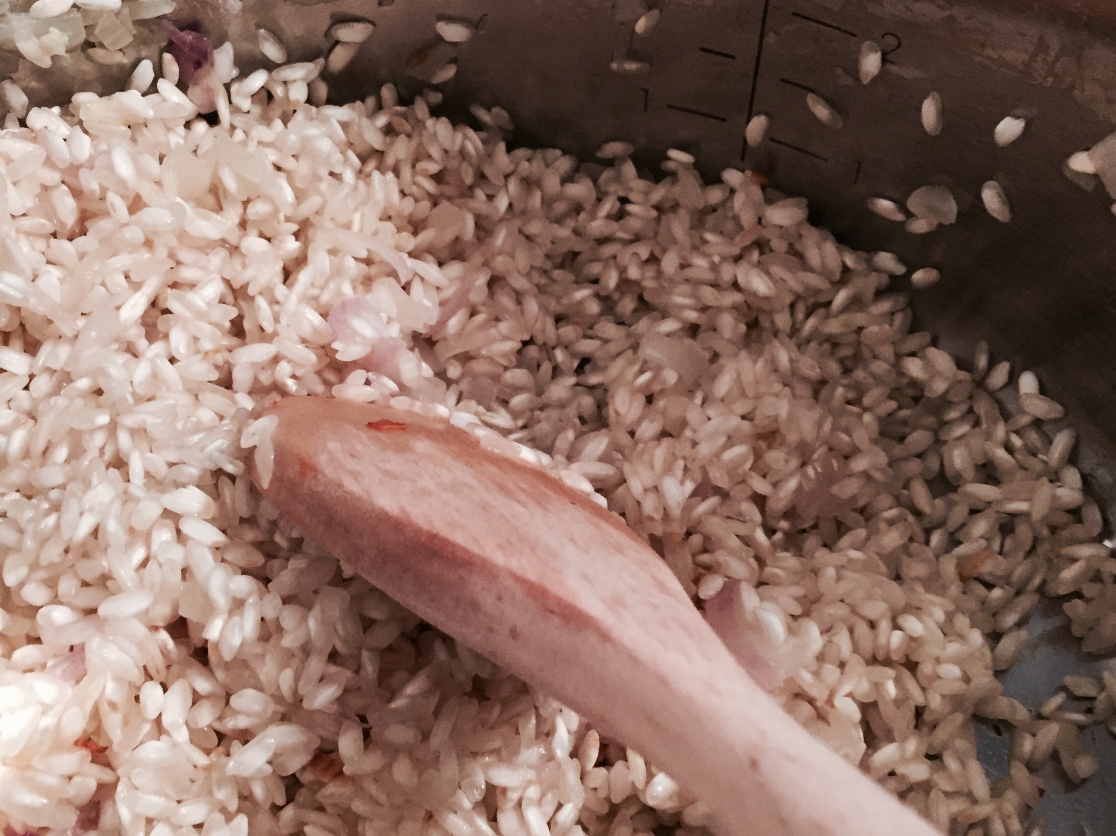 Den Risottoreis dazugeben und gut rösten, mit Weisswein löschen und bei kleiner Hitze langsam reduzieren.