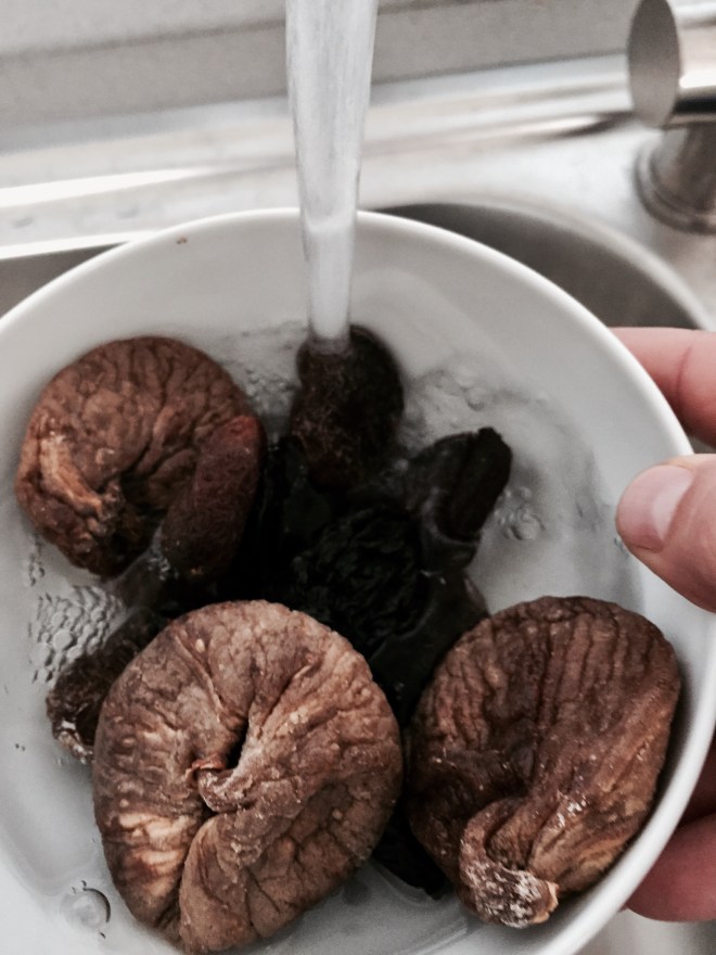 Die getrockneten Früchte sehr fein schneiden, dabei das Einweichwasser auffangen.