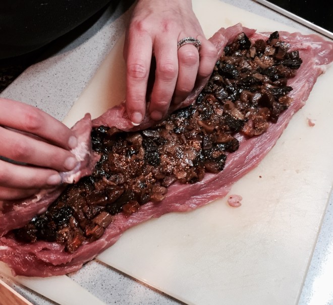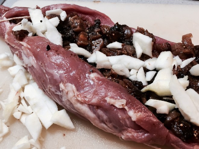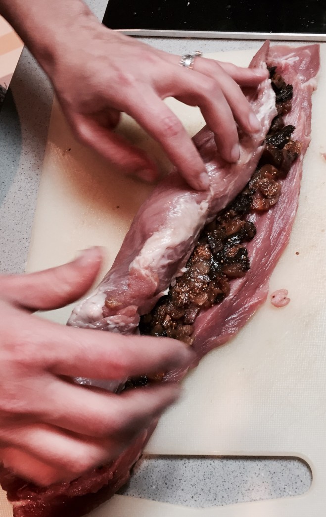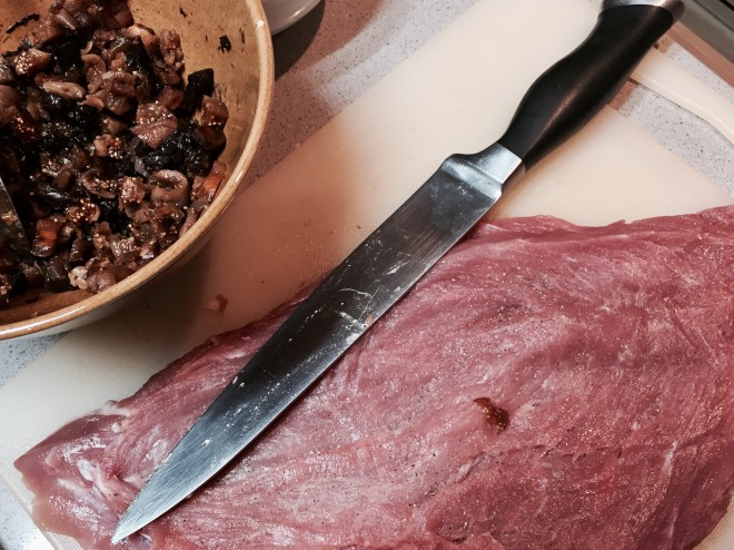 In der Zwischenzeit das Schweinefilet so vorbereiten, damit man die Füllung darauf verteilen und dann aufrollen kann. Dafür am besten das Filet bis auf ein 1cm einschneiden und aufklappen. Dann einen weiteren Schnitt auf beiden dickeren Filetstücken recht und links machen, sodass das Filetstück flach wird. Mit dem Fleischklopfer etwas flach klopfen.