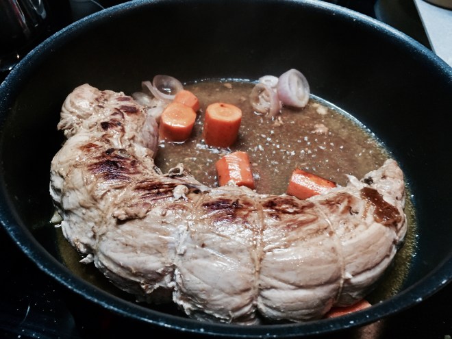 In einer Pfanne Olivenöl etwas Butter, ca. ein Esslöffel und 1 Zweiglein Thymian schmelzen lassen und das Schweinefilet von allen Seiten gut anbraten. Eine Karotte und eine Schalotte in groben Stücken dazugeben und einige Minuten mitdünsten.