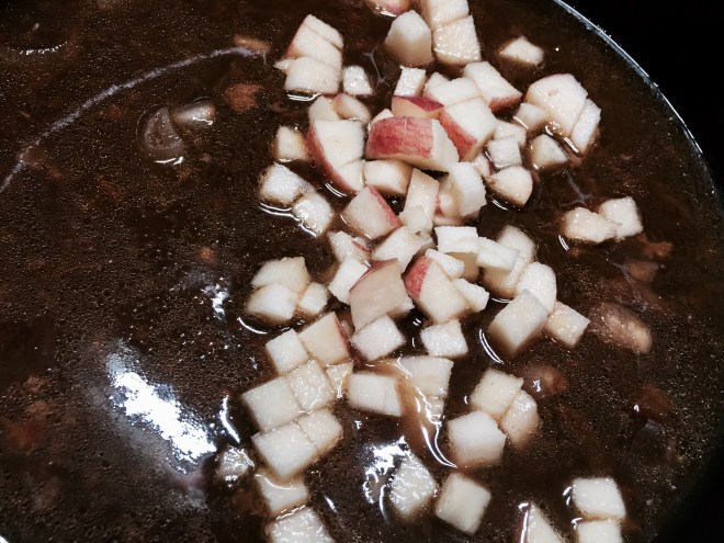 Für die Sauce die Karotte und die Schalotte aus der Bratflüssigkeit entfernen und in die in Würfel geschnittene andere Hälfte des Apfel dazugeben.