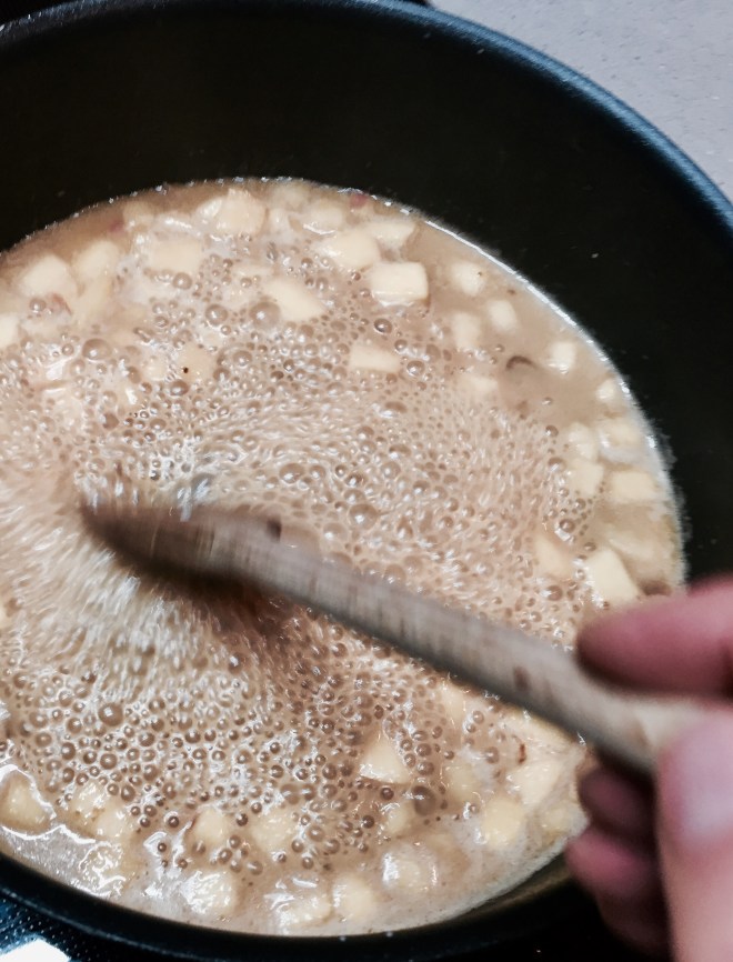 Mit Marsala (ca. 1/2 Glas) löschen und einige Minuten einkochen lassen. Das Einweichwasser dazugiessen und max. 20 Minuten mit geschlossenen Deckel vor sich hin köcheln lassen.