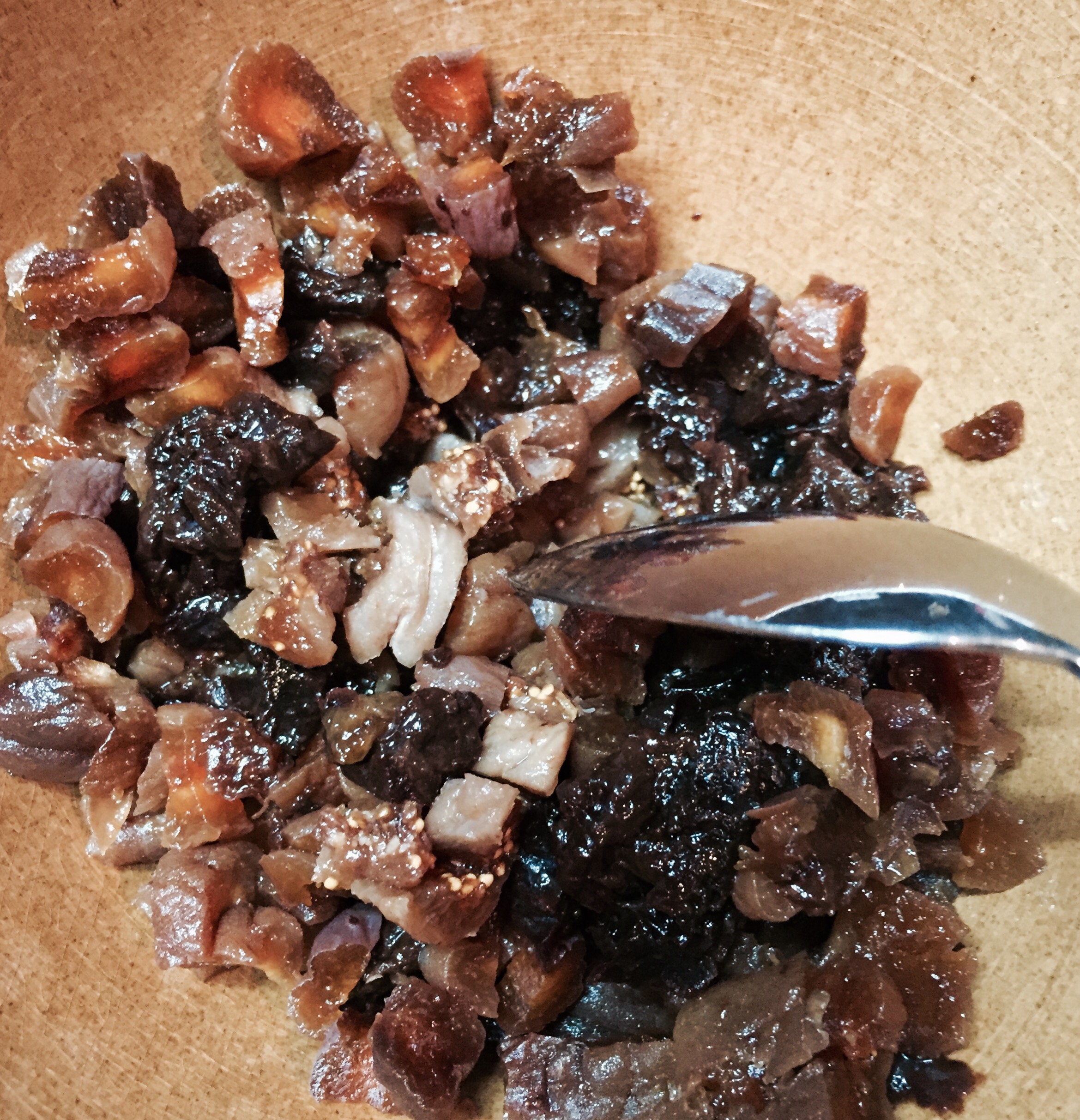 Die getrockneten Früchte sehr fein schneiden, dabei das Einweichwasser auffangen.