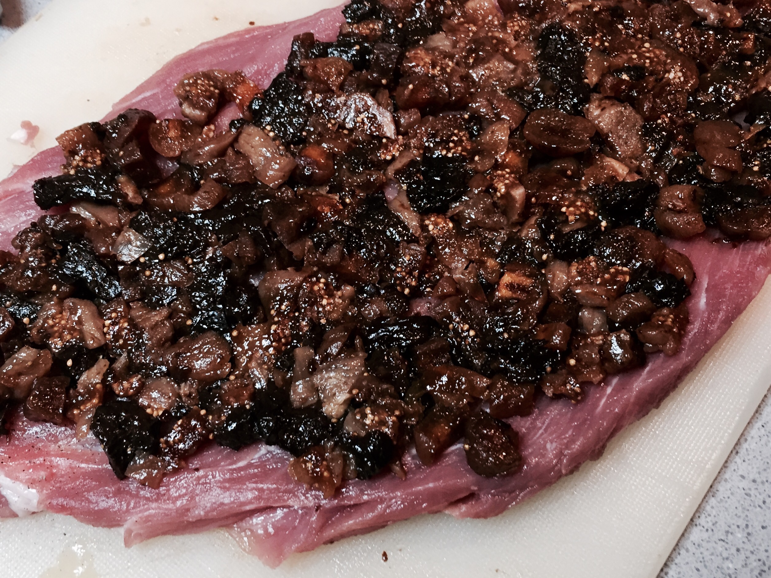 In der Zwischenzeit das Schweinefilet so vorbereiten, damit man die Füllung darauf verteilen und dann aufrollen kann. Dafür am besten das Filet bis auf ein 1cm einschneiden und aufklappen. Dann einen weiteren Schnitt auf beiden dickeren Filetstücken recht und links machen, sodass das Filetstück flach wird. Mit dem Fleischklopfer etwas flach klopfen.